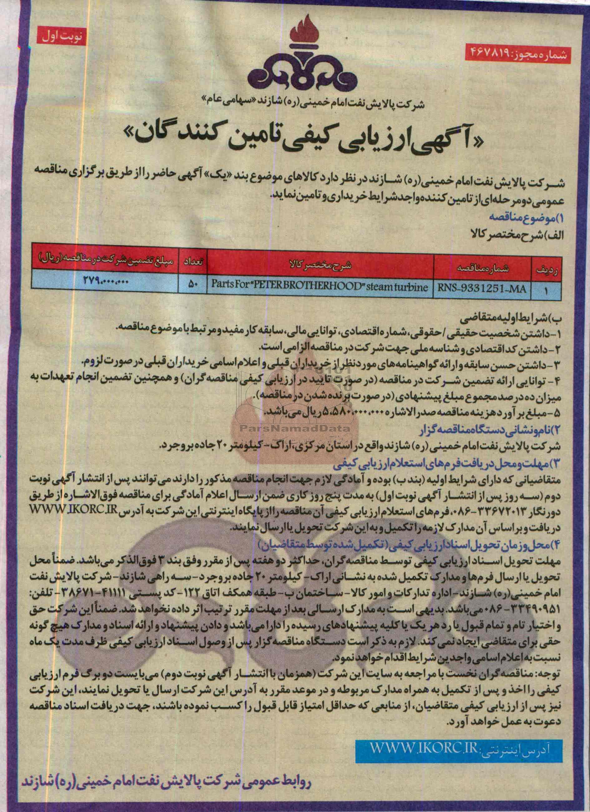 متقاضیانی که دارای شرایط اولیه بند ب بوده و آمادگی لازم جهت انجام هر یک از مناقصه مذکور را دارند می توانند پس از انتشار آگهی نوبت دوم (سه روز پس از انتشار آگهی نوبت اول) به مدت پنج روز کاری ضمن ارسال تقاضای شرکت در مناقصه موردنظر از طریق نمابر 33672013-086 فرمهای استعلام ارزیابی کیفی را از پایگاه اینترنتی این شرکت به آدرس WWW.IKORC.IR دریافت و بر اساس آن مدارک لازمه را تکمیل و صرفاً بر روی لوح فشرده (CD) به این شرکت تحویل یا ارسال نمایند