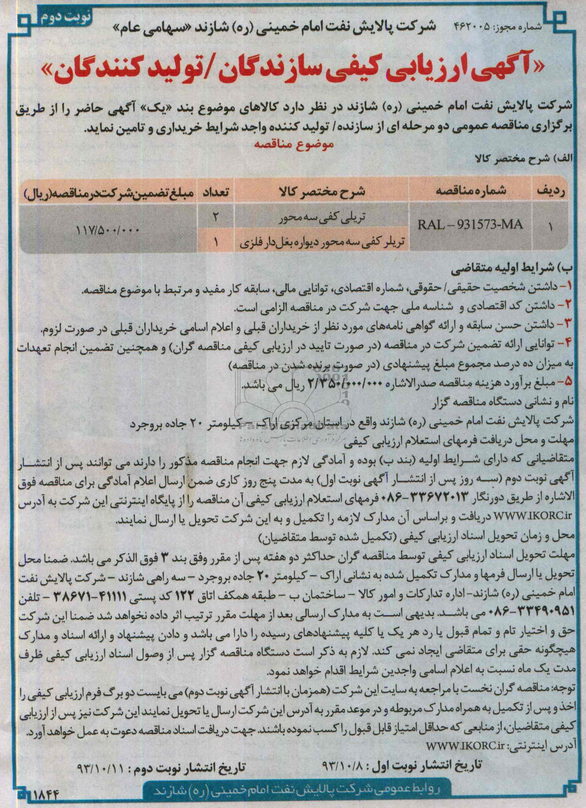 مناقصه تریلر کفی سه محور, آگهی ارزیابی کیفی تولید کنندگان , مناقصه تریلی کفی سه محور