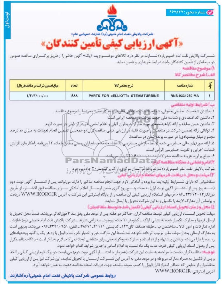 متقاضیانی که دارای شرایط اولیه بند ب بوده و آمادگی لازم جهت انجام مناقصه مذکور را دارند می توانند پس از انتشار اگهی نوبت دوم (سه روز پس از انتشار آگهی نوبت اول) به مدت پنج روز کاری ضمن ارسال اعلام آمادگی برای مناقصه فوق الاشاره از طریق دورنگار 33672013-086 فرمهای استعلام ارزیابی کیفی آن مناقصه را از پایگاه اینترنتی این شرکت به آدرس WWW.IKORC.IR دریافت و بر اساس آن مدارک لازمه را تکمیل و به این شرکت تحویل یا ارسال نمایند.