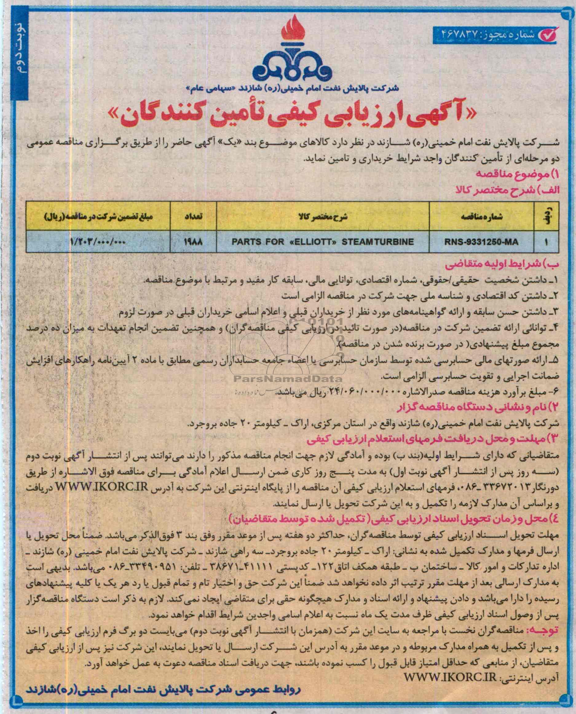 مناقصهPARTS FOR ELLIOTT STEAM TURBINE از کلیه افراد متخصص و شرکتها واجد شرایط دعوت به عمل میآید در مناقصه با کد خبرگزاری پارس نماد: 429129 شرکت نمایند.