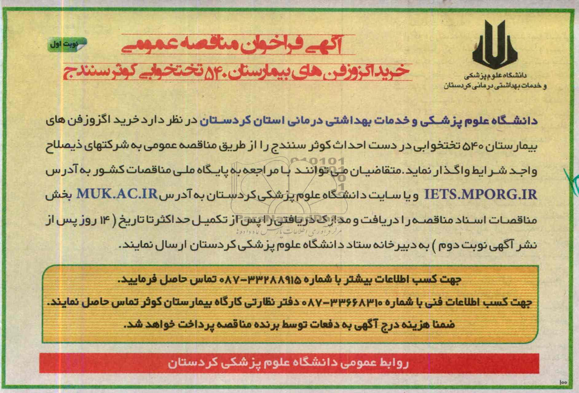 دانشگاه علوم پزشکی و خدمات بهداشتی درمانی استان کردستان در نظر دارد خرید اگزوز فن های بیمارستان 540 تختخوابی در دست احداث کوثر سنندج را از طریق مناقصه عمومی به شرکتهای ذیصلاح واجد شرایط واگذار نماید. متقاضیان می توانند با مراجعه به پایگاه ملی مناقصات کشور به آدرس IETS.MPORG.IR و یا سایت دانشگاه علوم پزشکی کردستان به آدرس MUK.AC.IR بخش مناقصات اسناد مناقصه را دریافت و مدارک دریافتی را پس از تکمیل حداکثر تا تاریخ 14 روز پس از نشر اگهی نوبت دوم به دبیرخانه ستاد دانشگاه علوم پزشکی کردستان ارسال نمایند