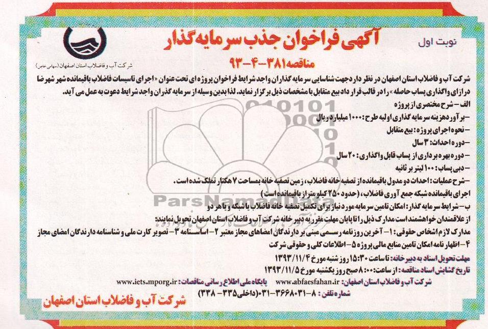 شرکت آب و فاضلاب استان اصفهان در نظر دارد جهت شناسایی سرمایه گذاران واجد شرایط فراخوان پروژه ای تحت عنوان اجرای تاسیسات فاضلاب باقیمانده شهر شهرضا در ازای واگذاری پساب حاصله را در قالب قرارداد بیع به متقابل با مشخصات ذیل برگزاری نماید. لذا بدین وسیله از سرمایه گذاران واچد شرایط دعوت به عمل می آید.