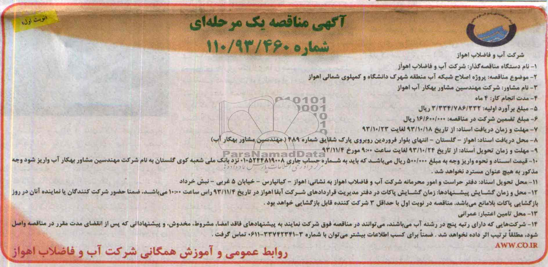 اگهی مناقصه عمومی یک مرحله ای نوبت اول شماره 110/93/460