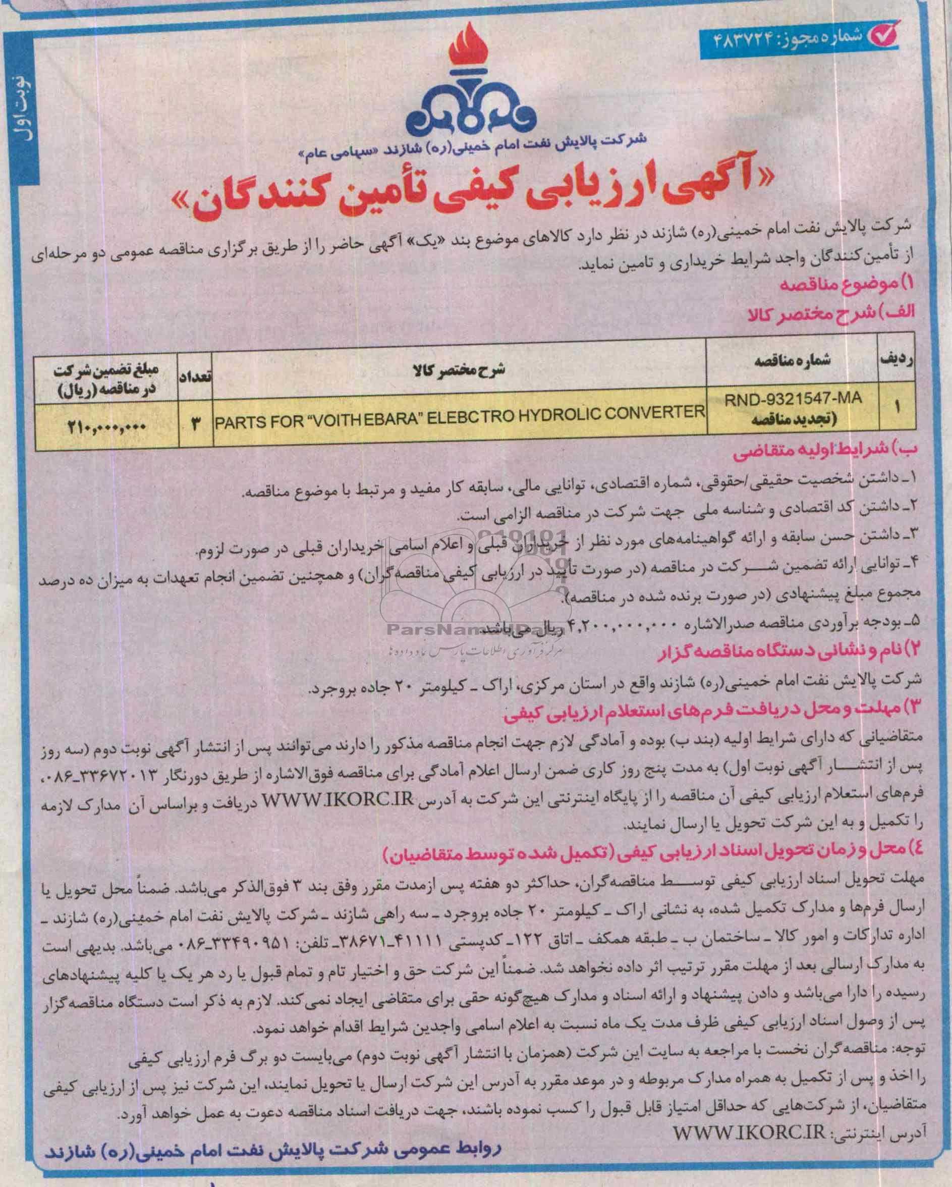 متقاضیانی که دارای شرایط اولیه بند ب بوده و آمادگی لازم جهت انجام هر یک از مناقصات مذکور را دارند می توانند پس از انتشار آگهی نوبت دوم سه روز پس از انتشار آگهی نوبت اول به مدت پنج روز کاری ضمن ارسال اعلام آمادگی برای مناقصه فوق الاشاره از طریق دورنگار 33672013-086 فرمهای استعلام ارزیابی کیفی را از پایگاه اینترنتی این شرکت به آدرس WWW.IKORC.IR دریافت و بر اساس آن مدارک لازمه را تکمیل و به این شرکت تحویل یا ارسال نمایند