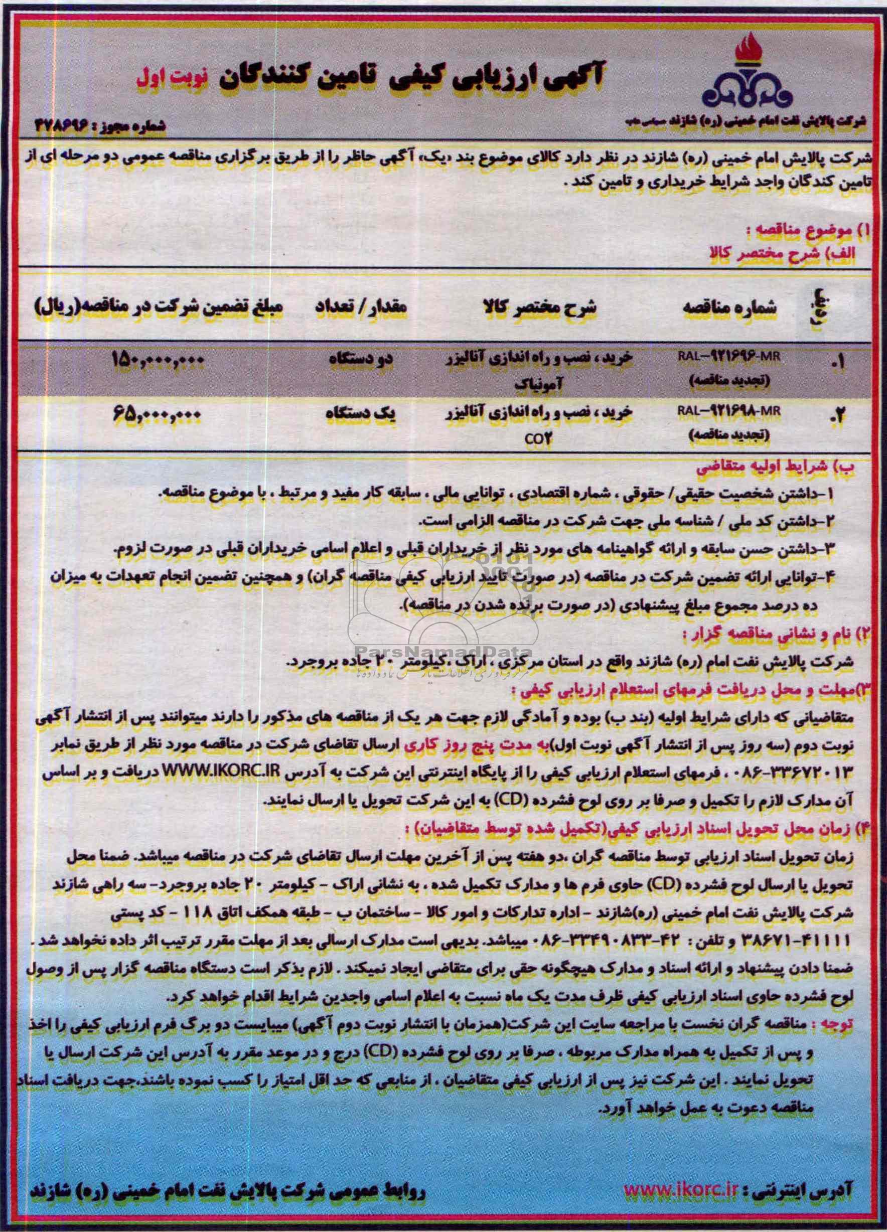 ارزیابی کیفی تامین کنندگان خرید ، نصب و راه اندازی آنالیزر آمونیاک از کلیه افراد متخصص و شرکتها واجد شرایط دعوت به عمل میآید در مناقصه با کد خبرگزاری پارس نماد: 432935 شرکت نمایند.