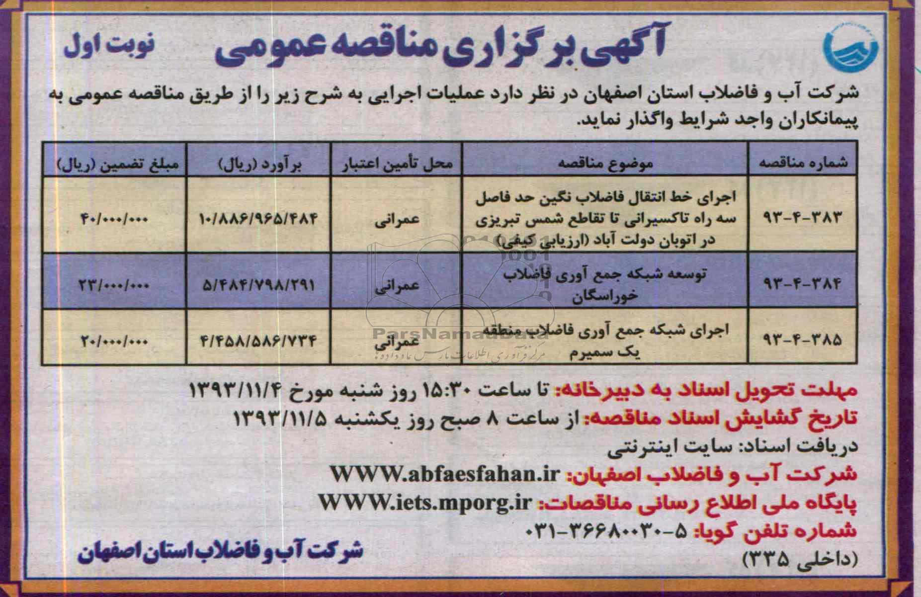 شرکت آب و فاضلاب استان اصفهان در نظر دارد عملیات اجرایی به شرح زیر را از طریق مناقصه عمومی به پیمانکاران واجد شرایط واگذار نماید