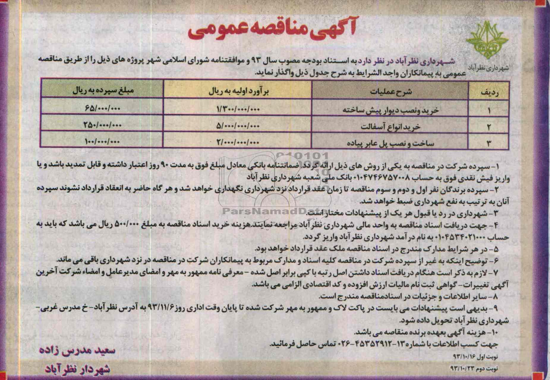شهرداری نظرآباد در نظر دارد به استناد بودجه مصوب سال 93 و موافقتنامه شورای اسلامی شهر پروژه های ذیل را از طریق مناقصه عمومی به پیمانکاران واجد شرایط به شرح جدول ذیل واگذار نماید