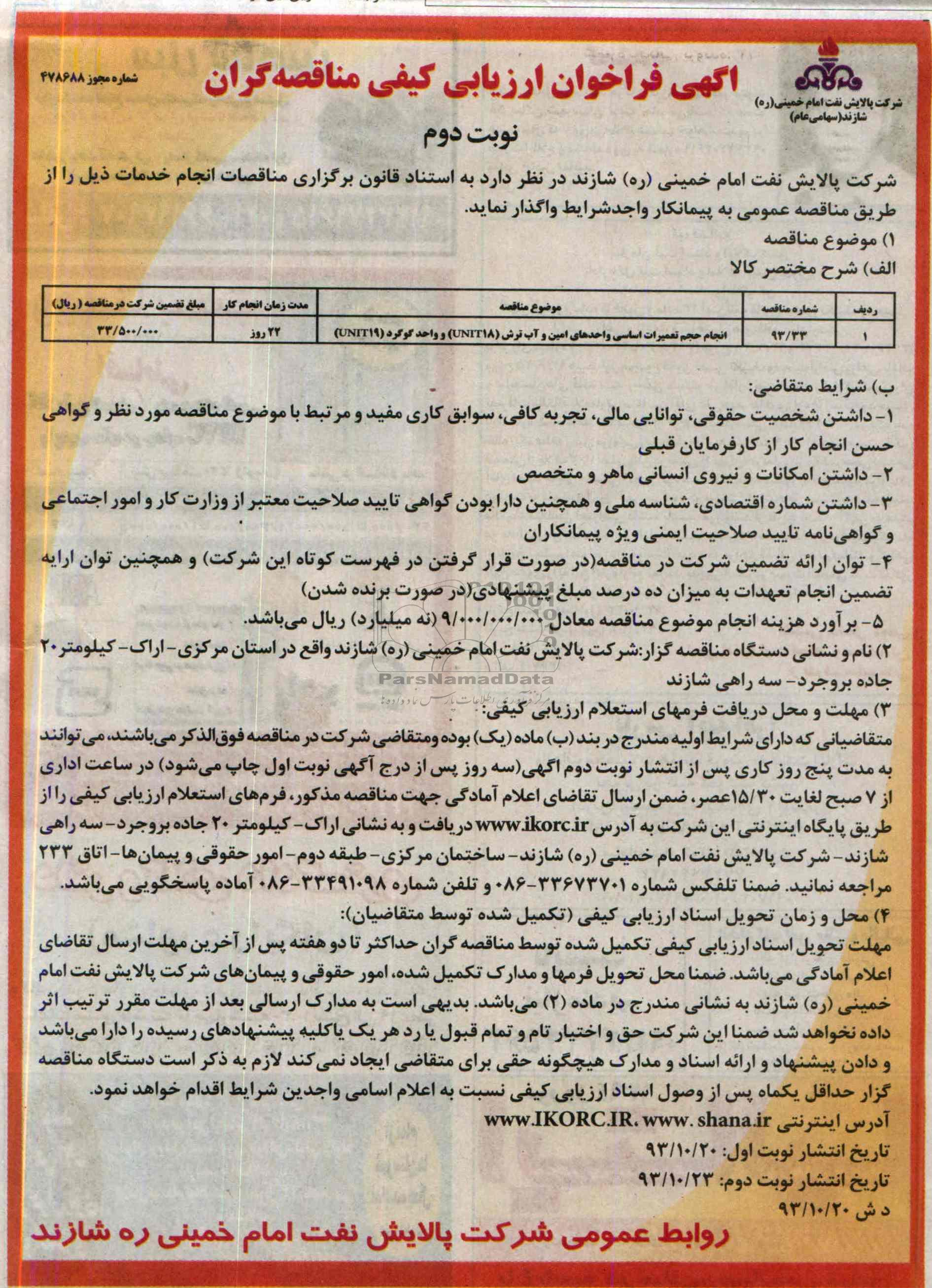 | 1 | 33/93 | انجام حجم تعمیرات اساسی واحدهای امین و آب ترش UNIT18 و واحد گوگرد UNIT19 | 22 روز | 33.500.000 |