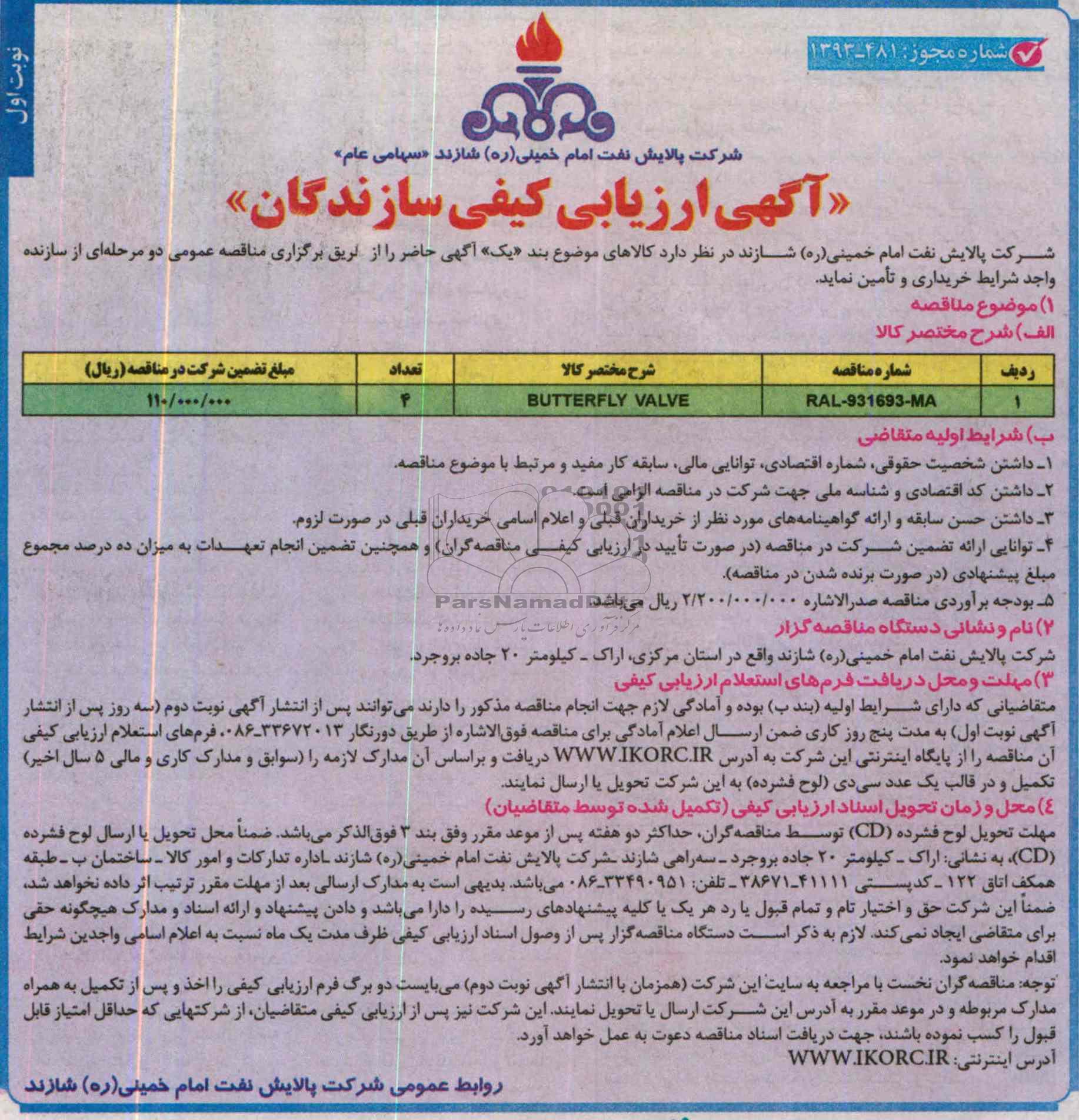BUTTERFLY VALVEارزیابی کیفی تامین کنندگان از کلیه افراد متخصص و شرکتها واجد شرایط دعوت به عمل میآید در مناقصه با کد خبرگزاری پارس نماد: 434762 شرکت نمایند.