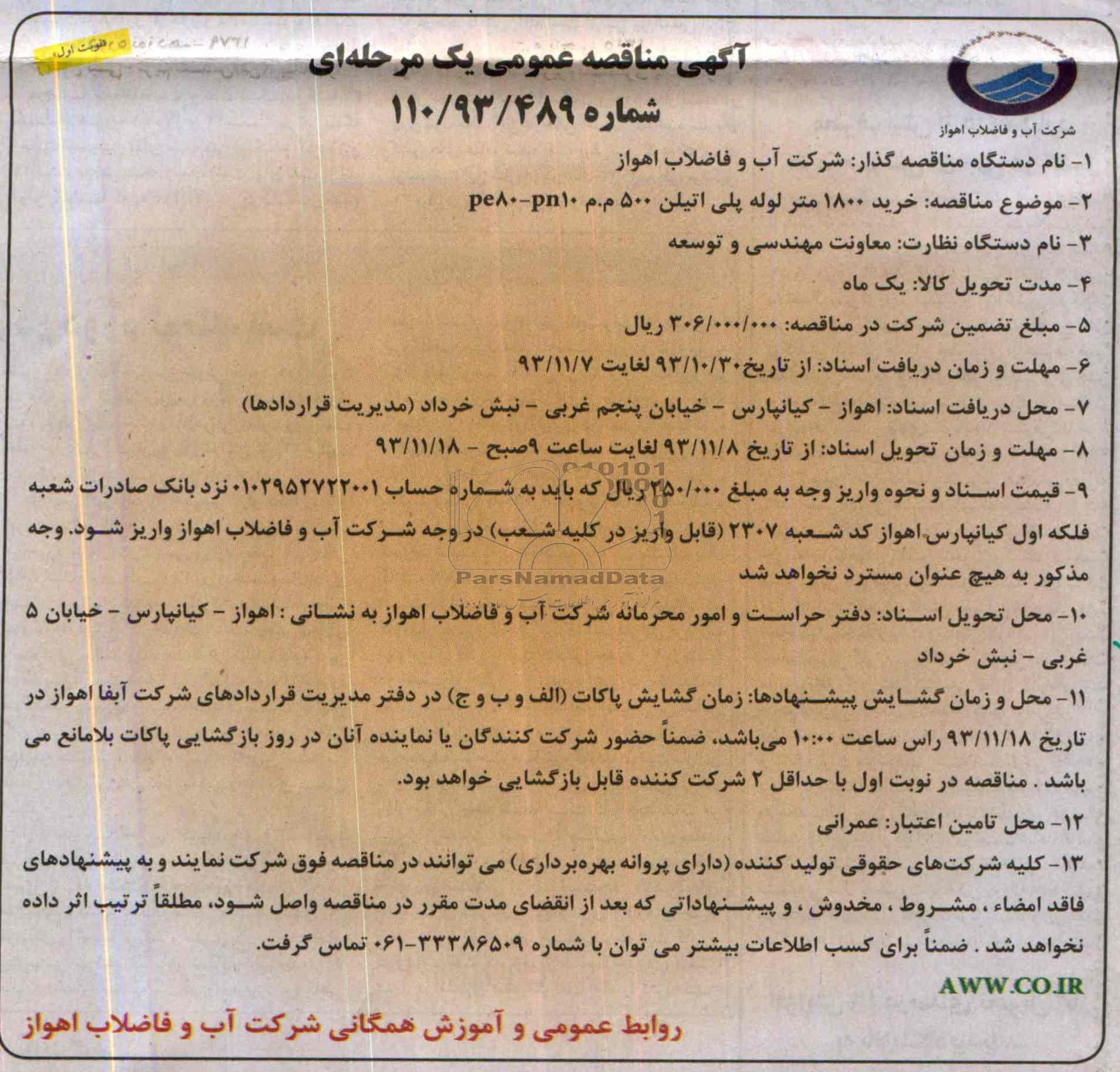 مناقصه عمومی خرید 1800 متر لوله پلی اتیلن 500 م .م از کلیه افراد متخصص و شرکتها واجد شرایط دعوت به عمل میآید در مناقصه با کد خبرگزاری پارس نماد: 436916 شرکت نمایند.