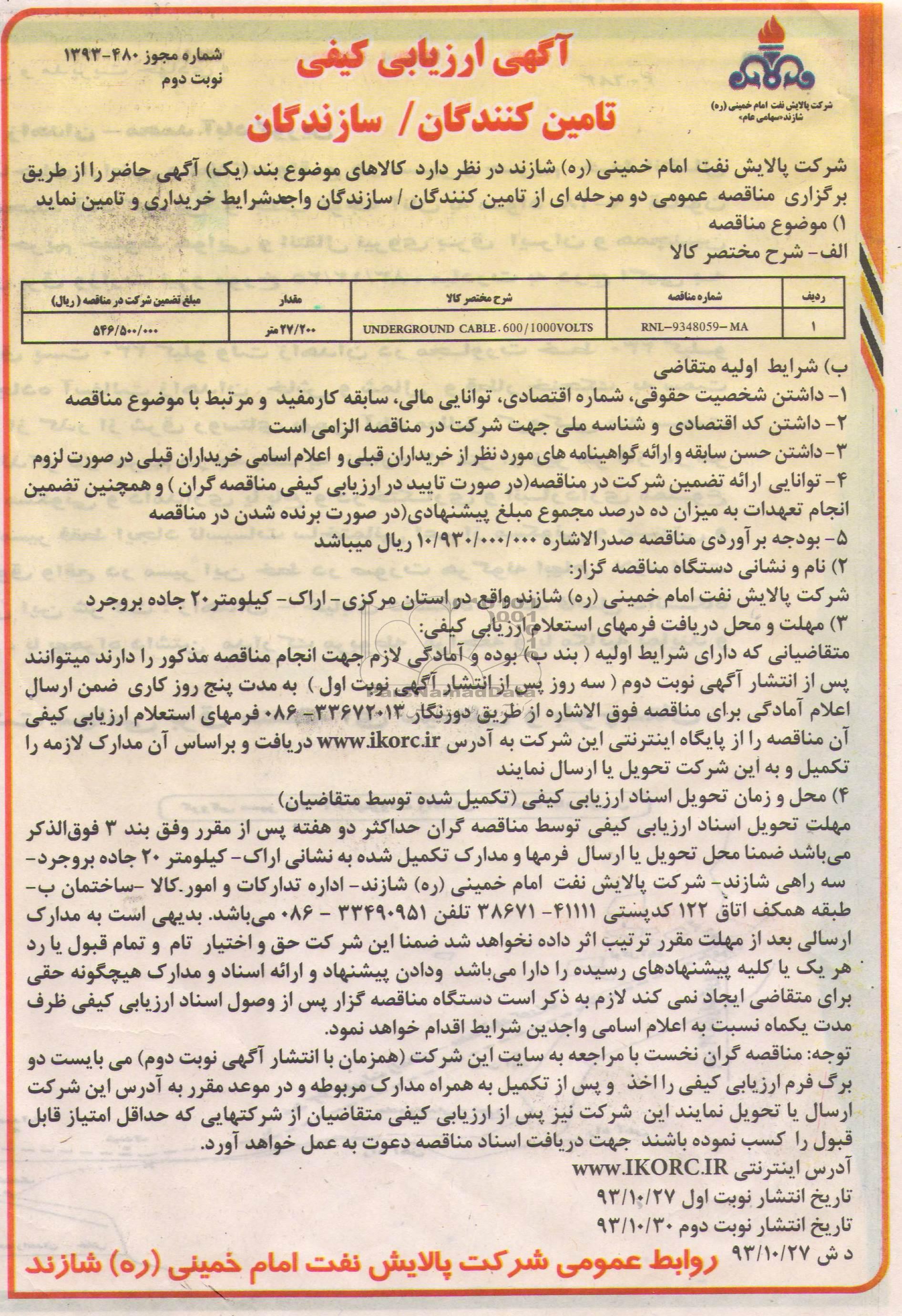 متقاضیانی که دارای شرایط اولیه بند ب بوده و آمادگی لازم جهت انجام هر یک از مناقصات مذکور را دارند می توانند پس از انتشار آگهی نوبت دوم سه روز پس از انتشار آگهی نوبت اول به مدت پنج روز کاری ضمن ارسال اعلام آمادگی برای مناقصه فوق الاشاره از طریق دورنگار 33672013-086 فرمهای استعلام ارزیابی کیفی را از پایگاه اینترنتی این شرکت به آدرس WWW.IKORC.IR دریافت و بر اساس آن مدارک لازم را تکمیل و صرفا بر روی لوح فشرده CD به این شرکت تحویل یا ارسال نمایند