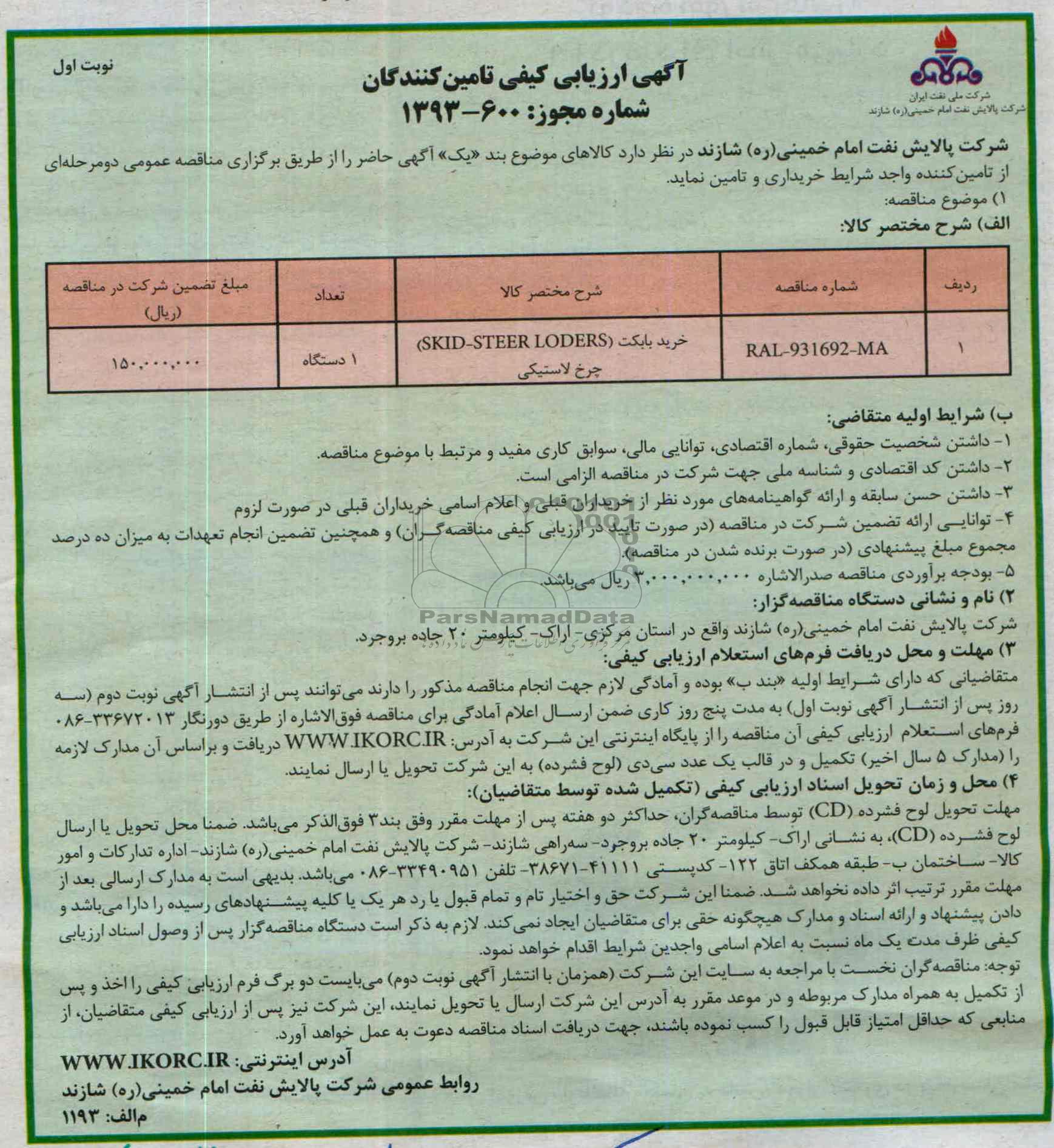 متقاضیانی که دارای شرایط اولیه بند ب بوده و آمادگی لازم جهت انجام هر یک از مناقصه مذکور را دارند می توانند پس از انتشار آگهی نوبت دوم (سه روز پس از انتشار آگهی نوبت اول) به مدت پنج روز کاری ضمن ارسال اعلام آمادگی برای مناقصه فوق الاشاره از طریق دورنگار 33672013-086 فرمهای استعلام ارزیابی کیفی را از پایگاه اینترنتی این شرکت به آدرس WWW.IKORC.IR دریافت و بر اساس آن مدارک لازمه را (مدارک 5 سال اخیر) تکمیل و در قالب یک عدد سی دی (لوح فشرده) و به این شرکت تحویل یا ارسال نمایند