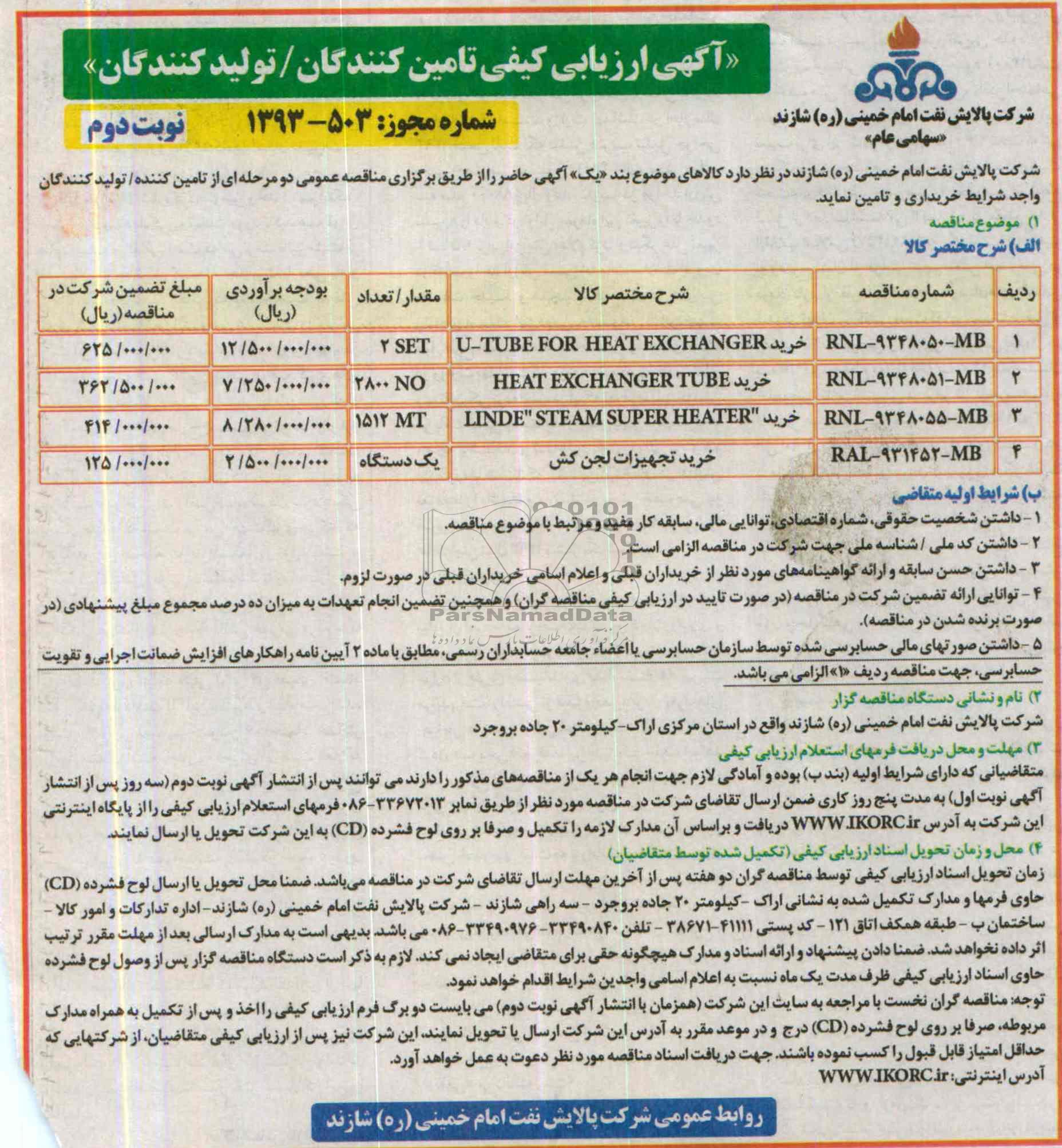 | 3 | RNL-9348055-MB | خرید LINDE "STEAM SUPER HEATER" | 1512 MT | 8.280.000.000 | 414.000.000 |