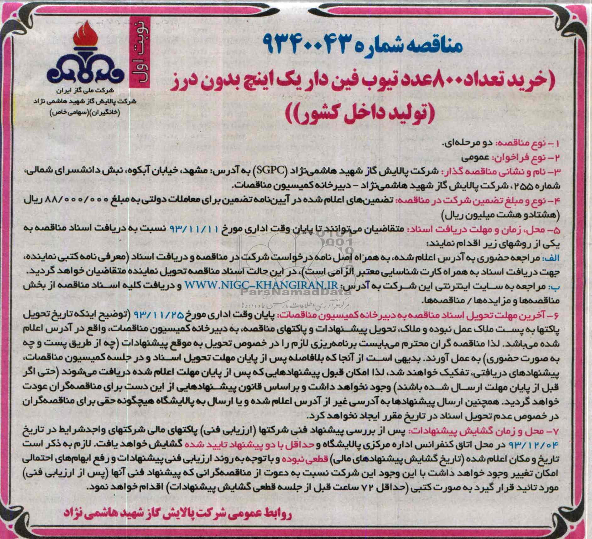 نام و نشانی مناقصه گذار: شرکت پالایش گاز شهید هاشمی نژاد SGPC به آدرس مشهد خیابان آبکوه نبش دانشسرای شمالی شماره 255 شرکت پالایش گاز شهید هاشمی نژاد دبیرخانه کمیسیون مناقصات