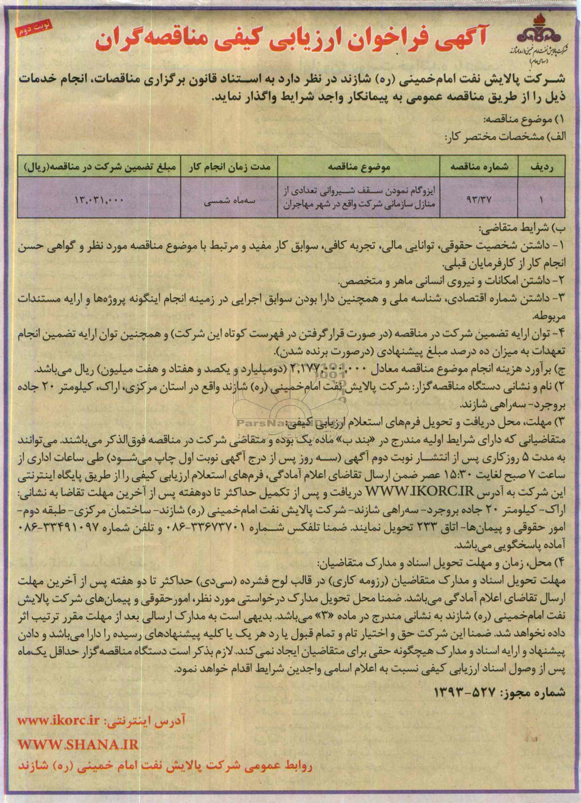 | 93/37 | ایزوگام نمودن سقف شیروانی تعدادی از منازل سازمانی شرکت واقع در شهر مهاجران |