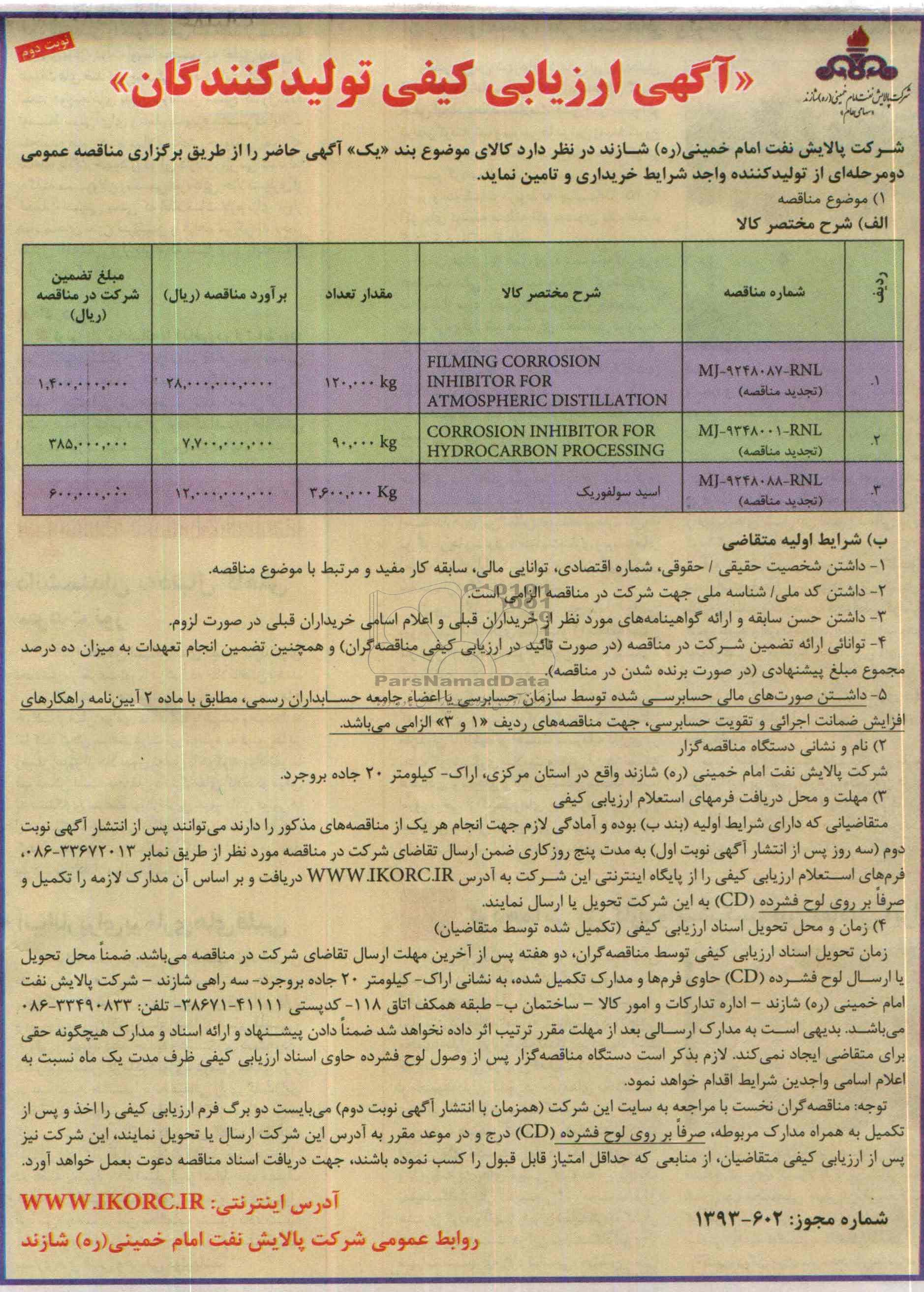 نام و نشانی دستگاه مناقصه گذار: شرکت پالایش نفت امام خمینی (ره) شازند، واقع در استان مرکزی، اراک، کیلومتر 20 جاده بروجرد