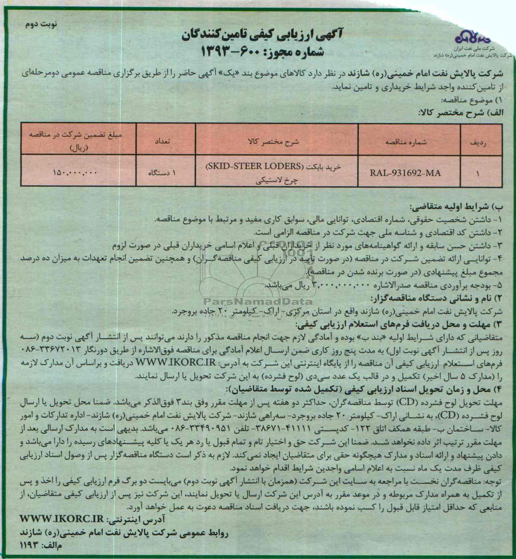 متقاضیانی که دارای شرایط اولیه بند ب بوده و آمادگی لازم جهت انجام هر یک از مناقصه مذکور را دارند می توانند پس از انتشار آگهی نوبت دوم (سه روز پس از انتشار آگهی نوبت اول) به مدت پنج روز کاری ضمن ارسال اعلام آمادگی برای مناقصه فوق الاشاره از طریق دورنگار 33672013-086 فرمهای استعلام ارزیابی کیفی را از پایگاه اینترنتی این شرکت به آدرس WWW.IKORC.IR دریافت و بر اساس آن مدارک لازمه را (مدارک 5 سال اخیر) تکمیل و در قالب یک عدد سی دی (لوح فشرده) و به این شرکت تحویل یا ارسال نمایند