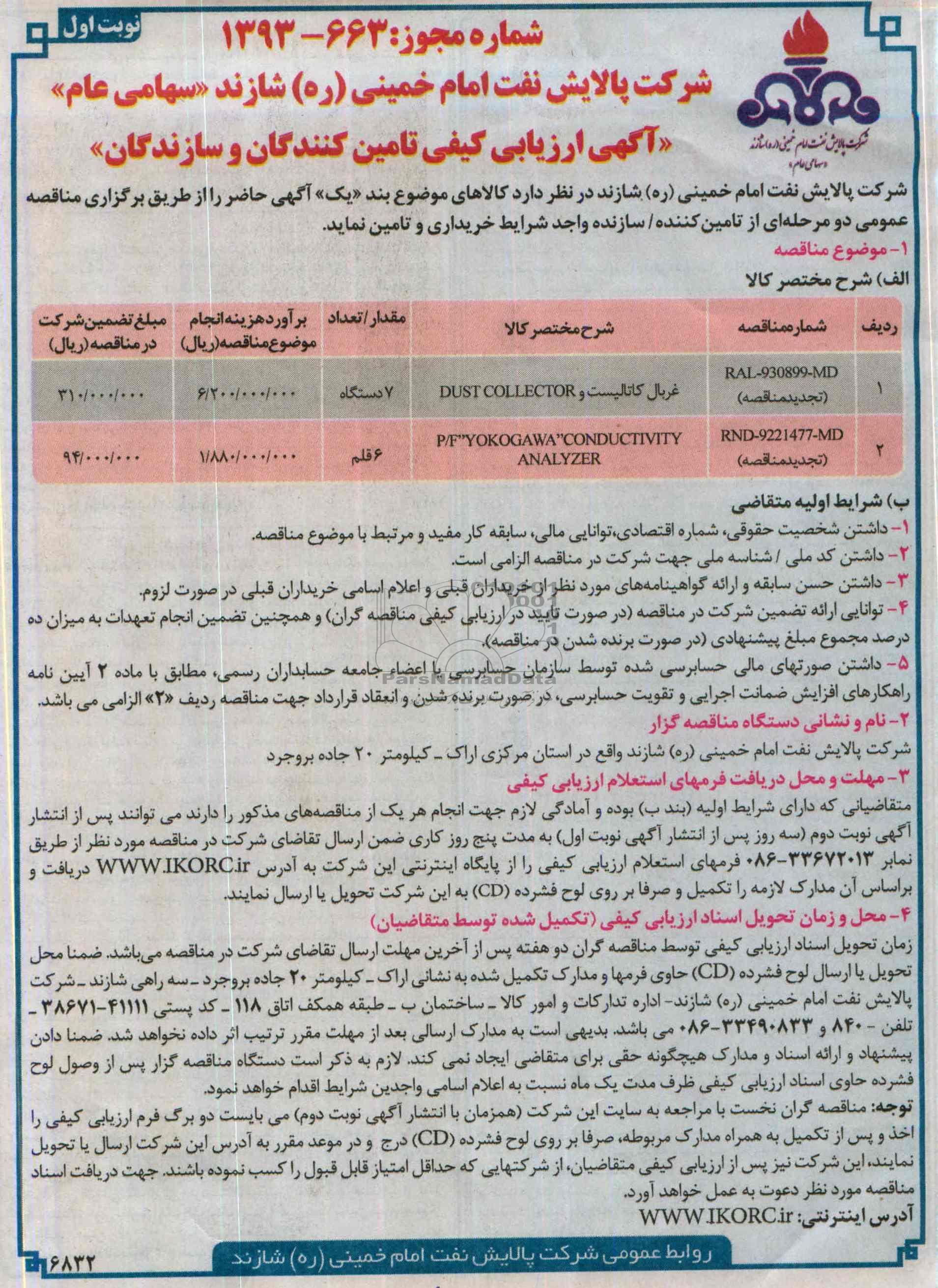 | 2 | RND-9221477-MD | P/F"YOKOGAW/A"CONDUCTIVITY ANALYZER | 6 قلم | 1.880.000.000 | 94.000.000 |