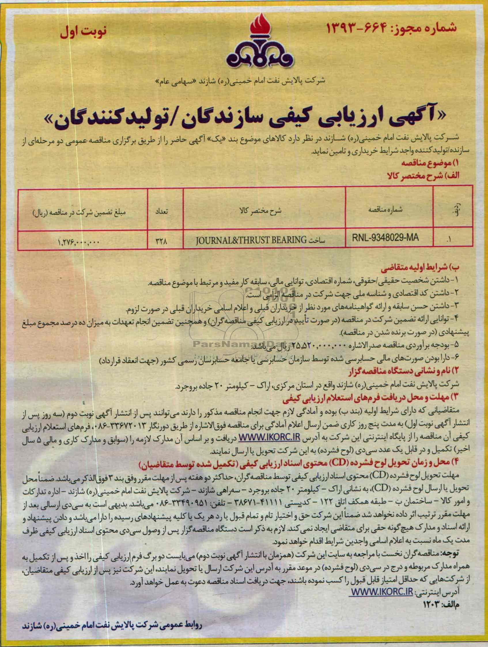 مناقصه ساخت JOURNAL & THRUST BEARING از کلیه افراد متخصص و شرکتها واجد شرایط دعوت به عمل میآید در مناقصه با کد خبرگزاری پارس نماد: 440000 شرکت نمایند.