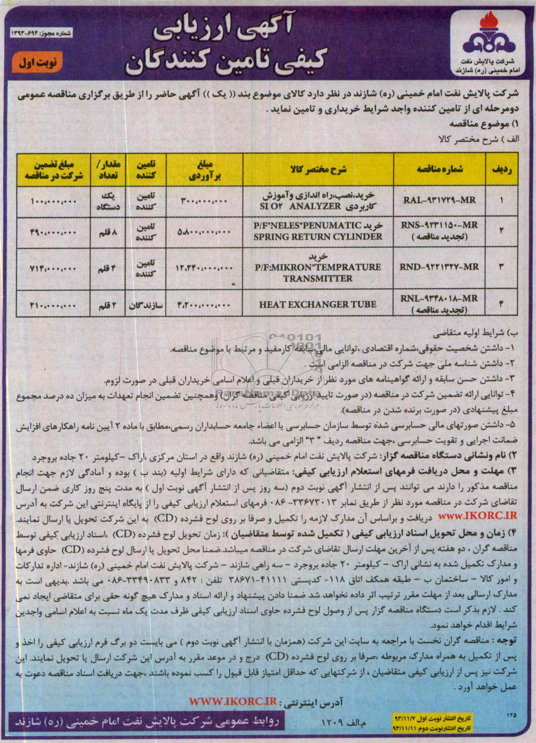 شرکت پالایش نفت امام خمینی (ره) شازند در نظر دارد کالاهای موضوع بند یک آگهی حاضر را از طریق برگزاری مناقصه عمومی دو مرحله ای از تامین کننده/ سازنده واجد شرایط خریداری و تامین نماید.
