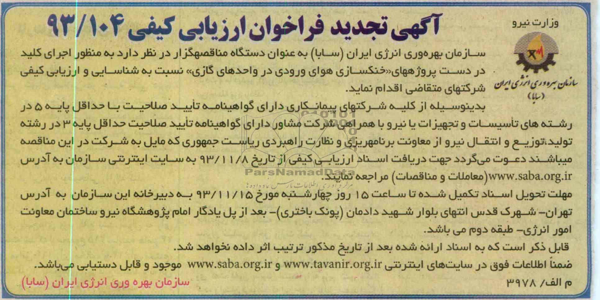 بدین وسیله از کلیه شرکتهای پیمانکاری دارای گواهینامه تایید صلاحیت با حداقل پایه 5 در رشته های تاسیسات و تجهیزات یا نیرو با همرانی شرکت مشاور دارای گواهینامه تایید صلاحیت حداقل پایه 3 در رشته تولید، توزیع و انتقال نیرو از معاونت برنامه ریزی و نظارت راهبردی ریاست جمهوری که مایل به شرکت در این مناقصه می باشند دعوت می گردد جهت دریافت اسناد ارزیابی کیفی از تاریخ 93.11.8 به سایت اینترنتی سازمان به آدرس www.saba.org.ir معاملات و مناقصات مراجعه نمایند.