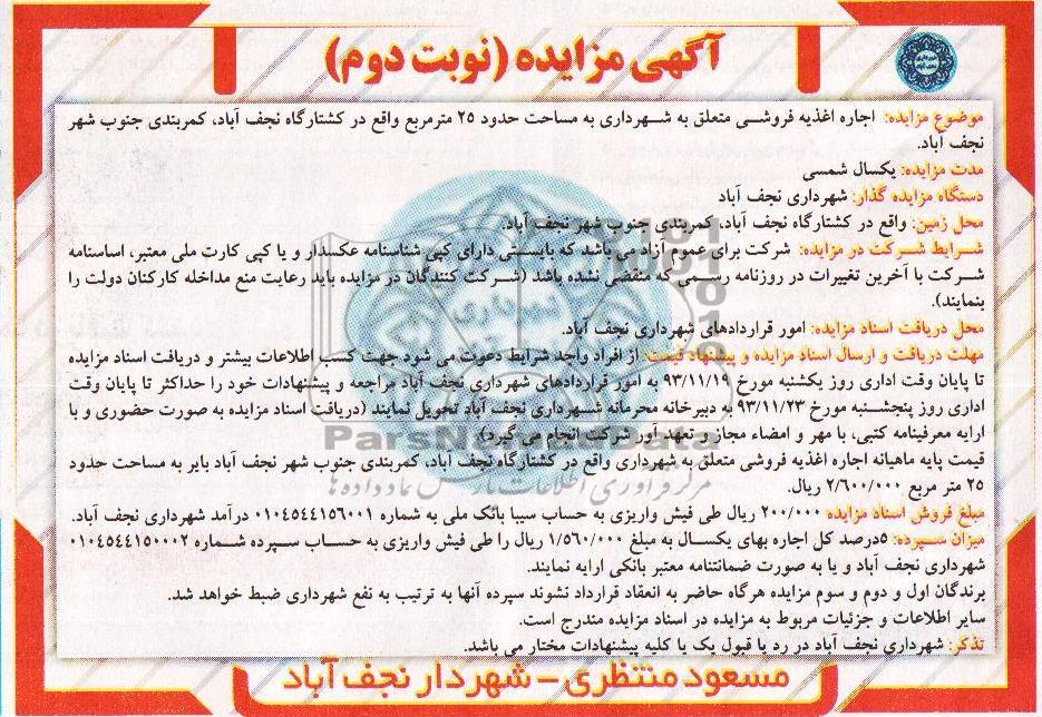 مهلت دریافت و ارسال اسناد مزایده و پیشنهاد قیمت : از افراد واجد شرایط دعوت می شود جهت كسب اطلاعات بیشتر و دریافت اسناد مزایده تا پایان وقت اداری روز یکشنبه مورخ93.11.19 به امور قراردادهای شهرداری نجف آباد مراجعه و پیشنهادات خود را حداكثر تا پایان وقت اداری روز پنج شنبه مورخ 93.11.23 به دبیرخانه محرمانه شهرداری نجف آباد تحویل نمایند (دریافت اسناد مزایده به صورت حضوری و با ارائه معرفینامه كتبی، با مهر و امضاء مجاز و تعهدآور شركت انجام می گیرد) .