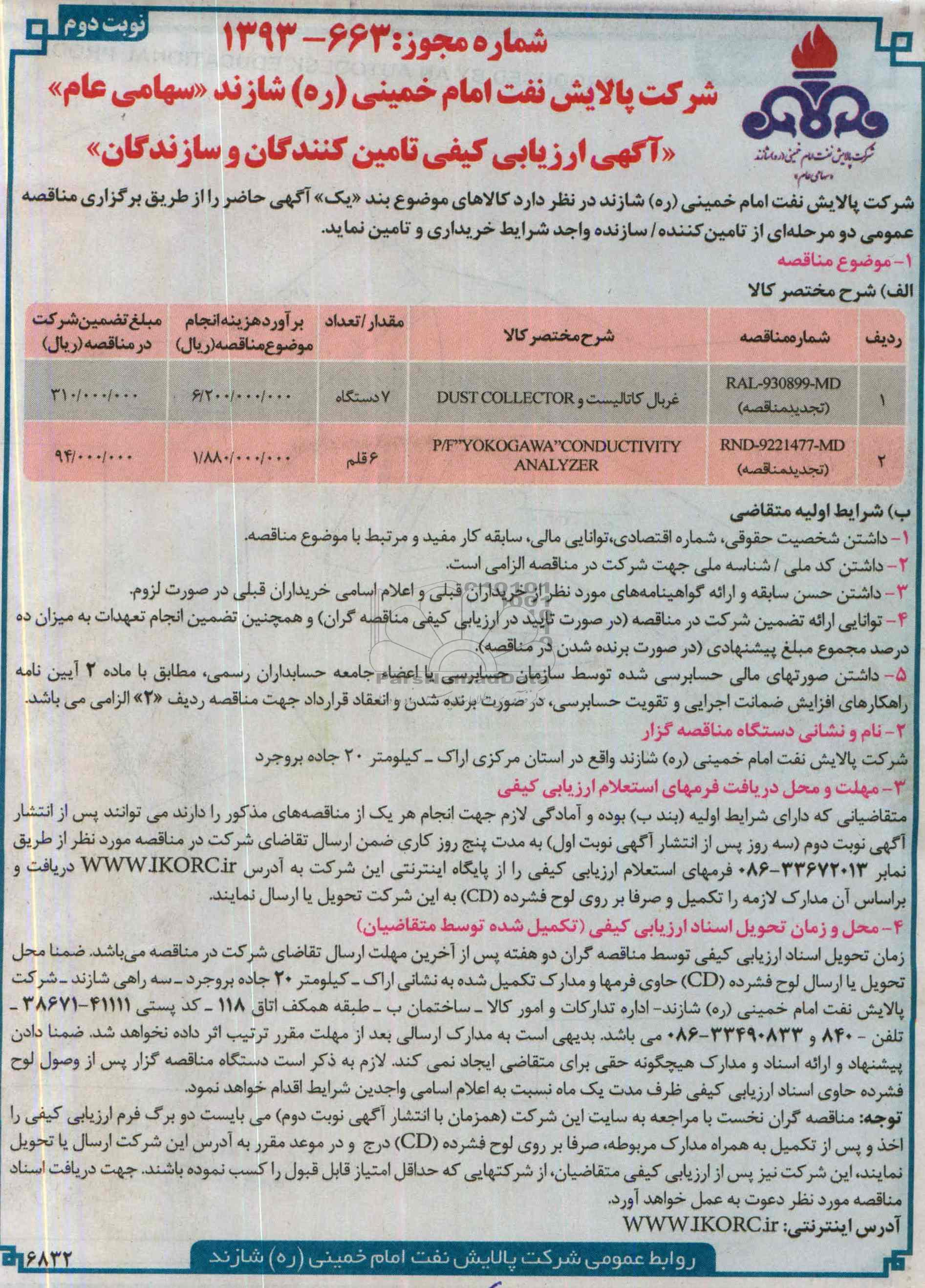 | 2 | RND-9221477-MD | P/F"YOKOGAW/A"CONDUCTIVITY ANALYZER | 6 قلم | 1.880.000.000 | 94.000.000 |