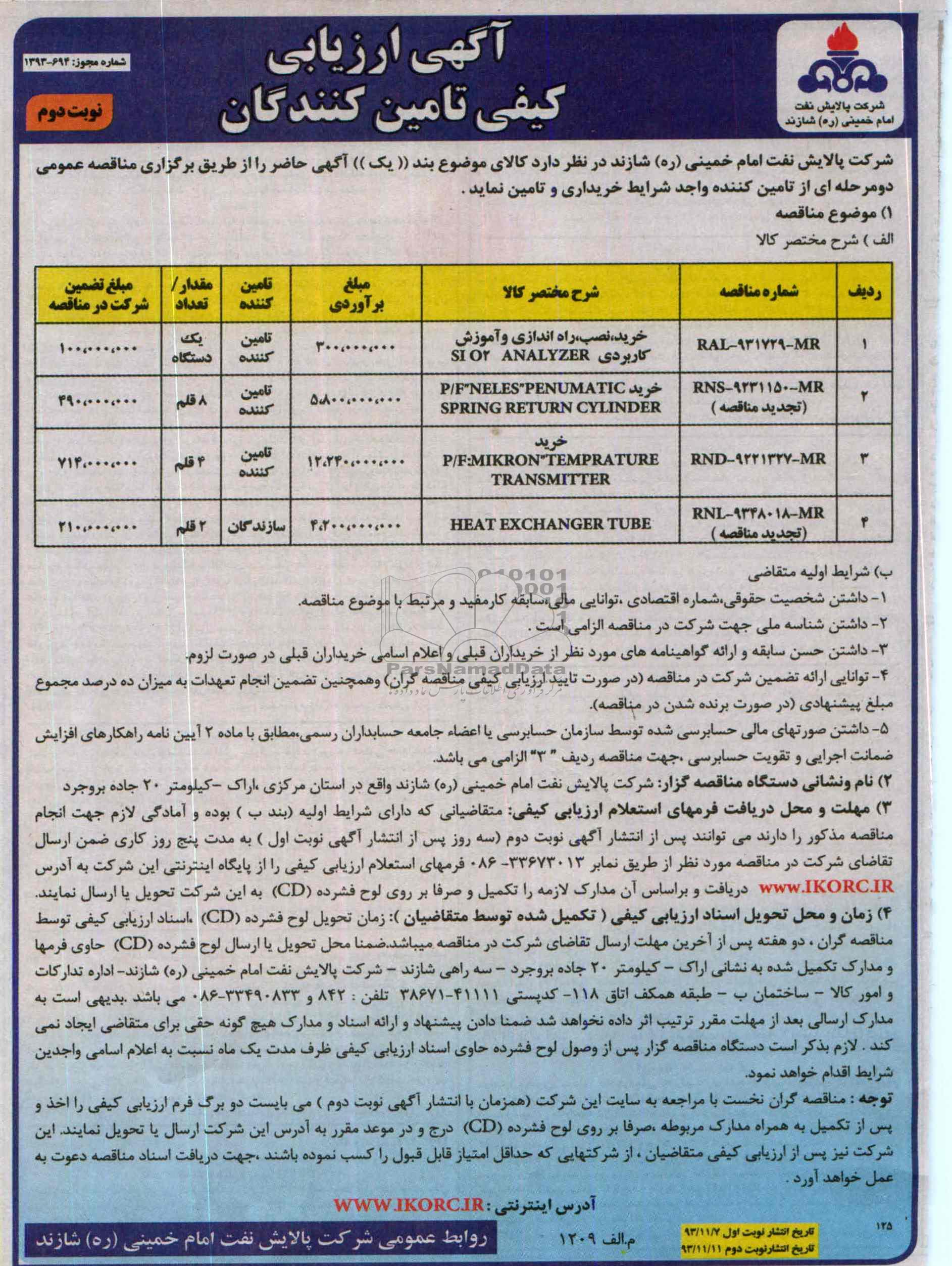 شرکت پالایش نفت امام خمینی (ره) شازند در نظر دارد کالاهای موضوع بند یک آگهی حاضر را از طریق برگزاری مناقصه عمومی دو مرحله ای از تامین کننده/ سازنده واجد شرایط خریداری و تامین نماید.