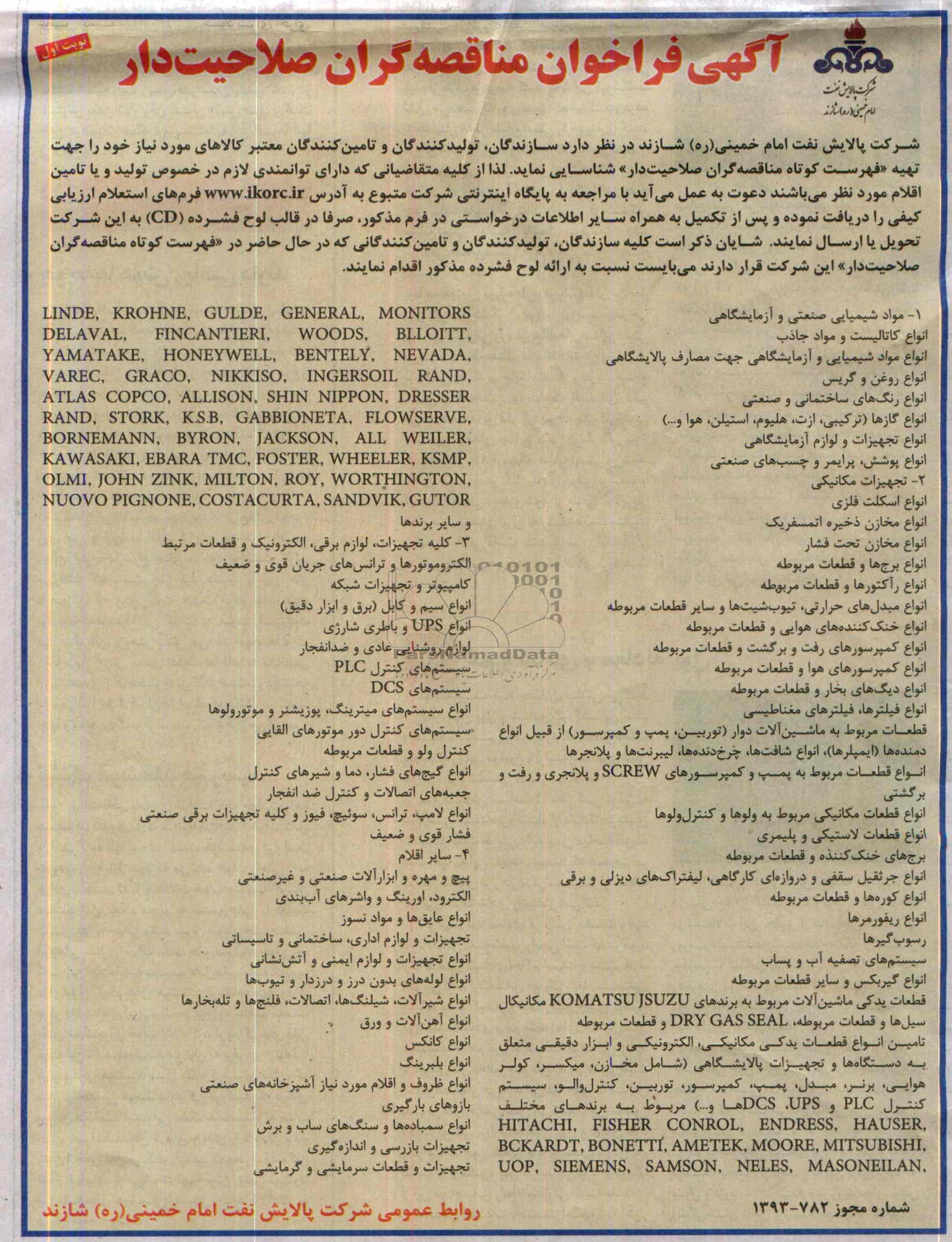 شرکت پالایش نفت امام خمینی ره شازند در نظر دارد سازندگان ، تولیدکنندگان و تامین کنندگان معتبر کالاهای موردنیاز خود را جهت تهیه فهرست کوتاه مناقصه گران صلاحیت دار شناسایی نماید. لذا از کلیه متقاضیانی که دارای توانمندی لازم در خصوص تولید و یا تامین اقلام موردنظر می باشند دعوت به عمل می آید با مراجعه به پایگاه اینترنتی شرکت متبوع به آدرس WWW.IKORC.IR فرم های استعلام ارزیابی کیفی را دریافت نموده و پس از تکمیل به همراه سایر اطلاعات درخواستی در فرم مذکور ، صرفا در قالب لوح فشرده CD به این شرکت تحویل یا ارسال نمایند. شایان ذکرا ست کلیه سازندگان ، تولیدکنندگان و تامین کنندگانی که در حال حاضر در فهرست کوتاه مناقصه گران صلاحیت دار این شرکت قرار دارند می بایست نسبت هب ارائه لوح فشرده مذکور اقدام نمایند.