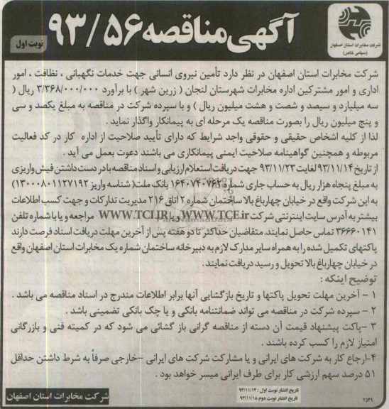 شرکت مخابرات استان اصفهان در نظر دارد مناقصه تامین نیروی انسانی جهت خدمات نگهبانی , نظافت , امور اداری و امور مشترکین اداره مخابرات شهرستان لنجان (زرین شهر ) با برآورد3.368.000.000 ریال ( سه میلیارد و سیصد و شصت و هشت میلیون ریال) و با سپرده شرکت در مناقصه به مبلغ 135.000.000ريال یکصد و سی و پنج کیلیون ریال را به صورت مناقصه یک مرحله ای به پیمانکار واگذار نماید.