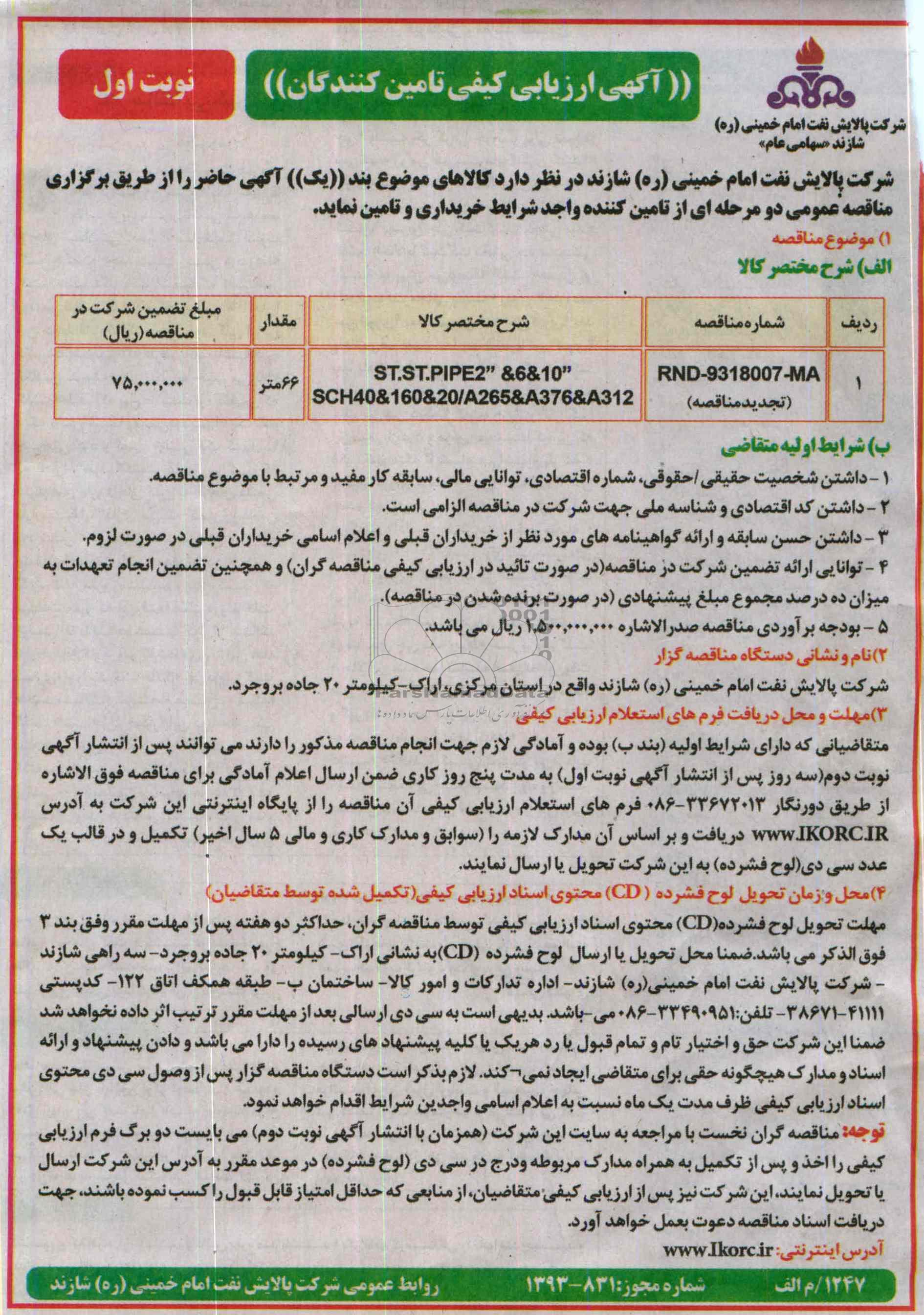 نام و نشانی دستگاه مناقصه گزار: شرکت پالایش نفت امام خمینی (ره) شازند واقع در استان مرکزی، اراک، کیلومتر 20 جاده بروجرد