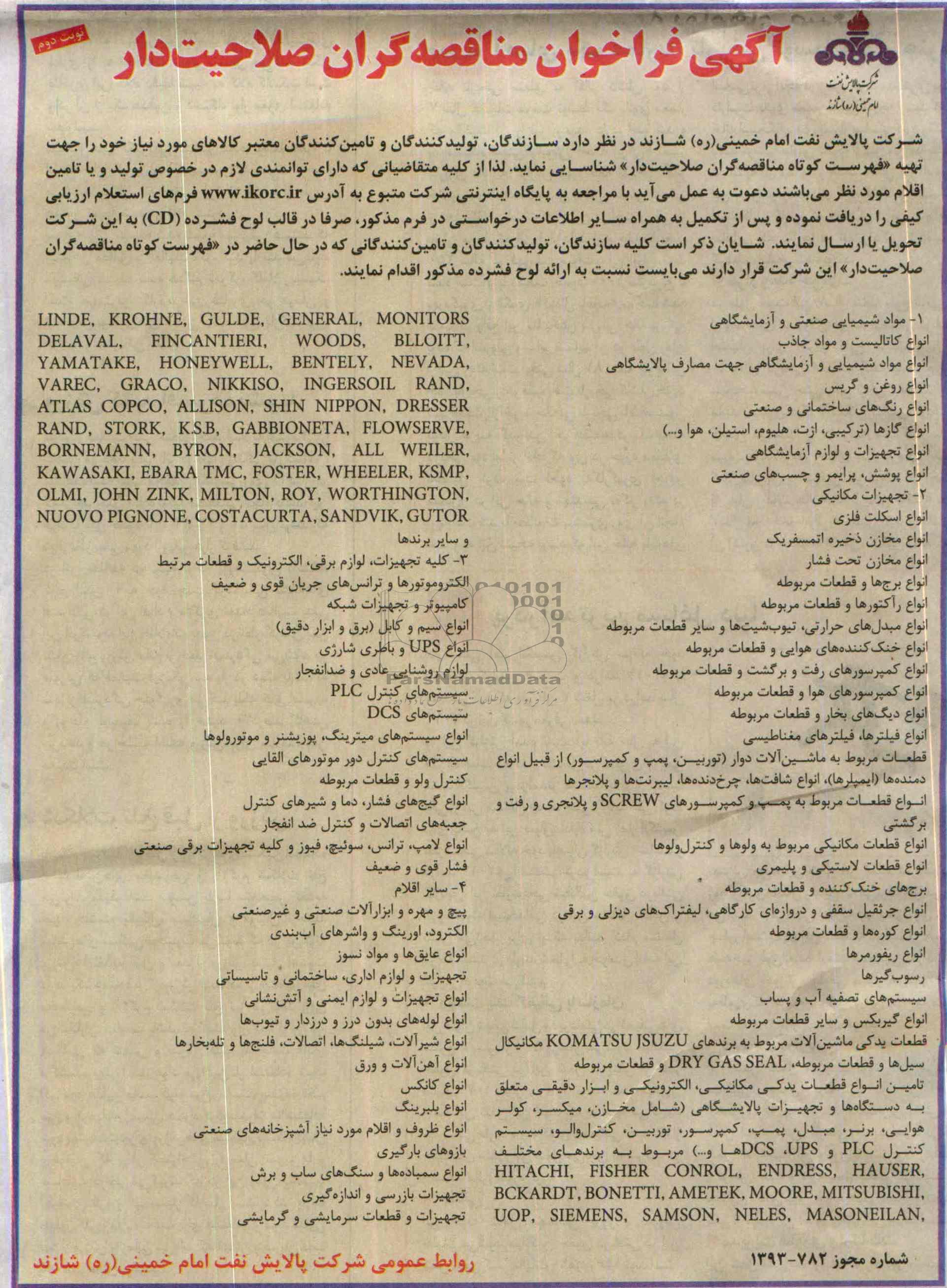 شرکت پالایش نفت امام خمینی ره شازند در نظر دارد سازندگان ، تولیدکنندگان و تامین کنندگان معتبر کالاهای موردنیاز خود را جهت تهیه فهرست کوتاه مناقصه گران صلاحیت دار شناسایی نماید. لذا از کلیه متقاضیانی که دارای توانمندی لازم در خصوص تولید و یا تامین اقلام موردنظر می باشند دعوت به عمل می آید با مراجعه به پایگاه اینترنتی شرکت متبوع به آدرس WWW.IKORC.IR فرم های استعلام ارزیابی کیفی را دریافت نموده و پس از تکمیل به همراه سایر اطلاعات درخواستی در فرم مذکور ، صرفا در قالب لوح فشرده CD به این شرکت تحویل یا ارسال نمایند. شایان ذکرا ست کلیه سازندگان ، تولیدکنندگان و تامین کنندگانی که در حال حاضر در فهرست کوتاه مناقصه گران صلاحیت دار این شرکت قرار دارند می بایست نسبت به ارائه لوح فشرده مذکور اقدام نمایند.
