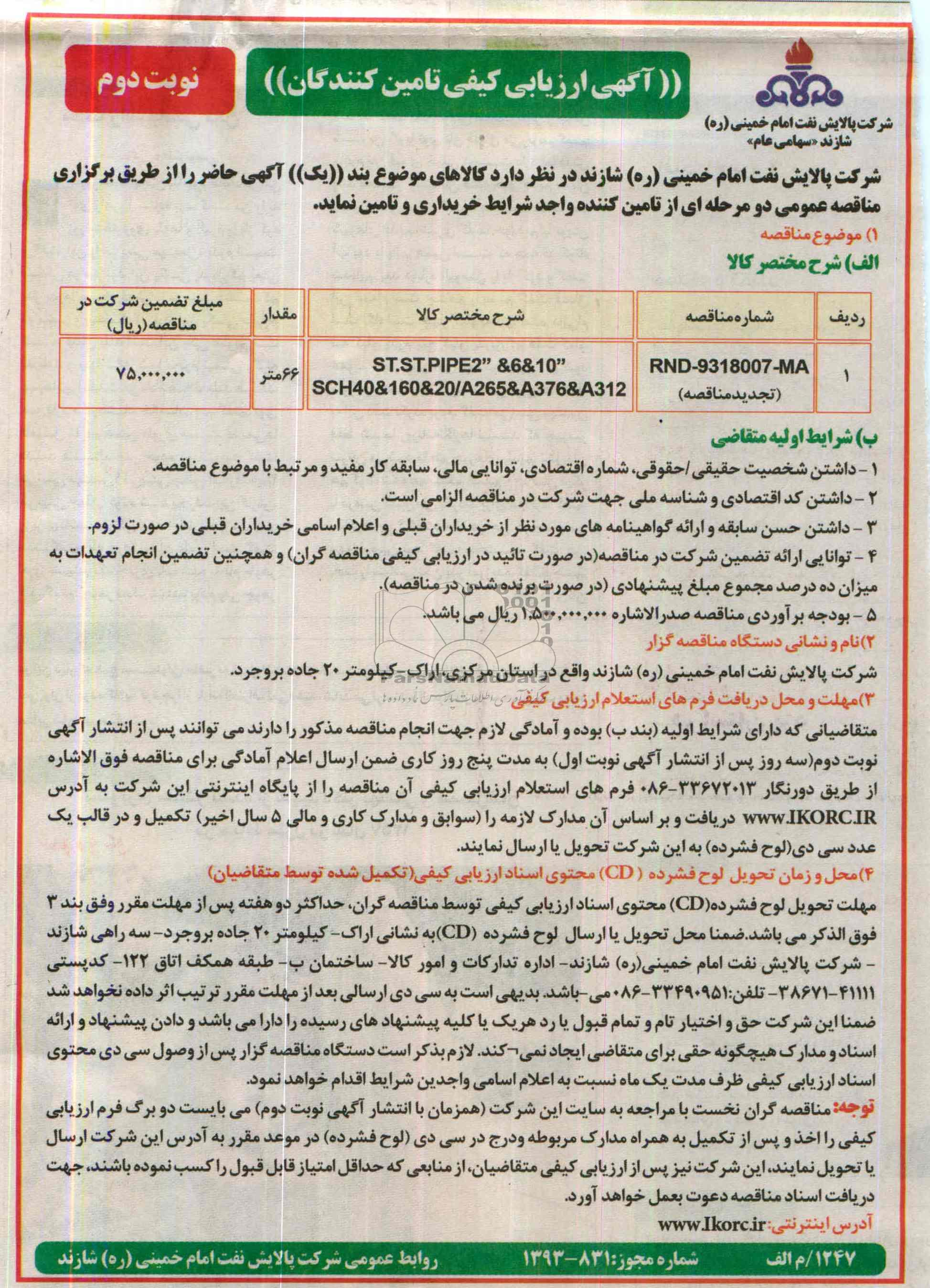 نام و نشانی دستگاه مناقصه گزار: شرکت پالایش نفت امام خمینی (ره) شازند واقع در استان مرکزی، اراک، کیلومتر 20 جاده بروجرد
