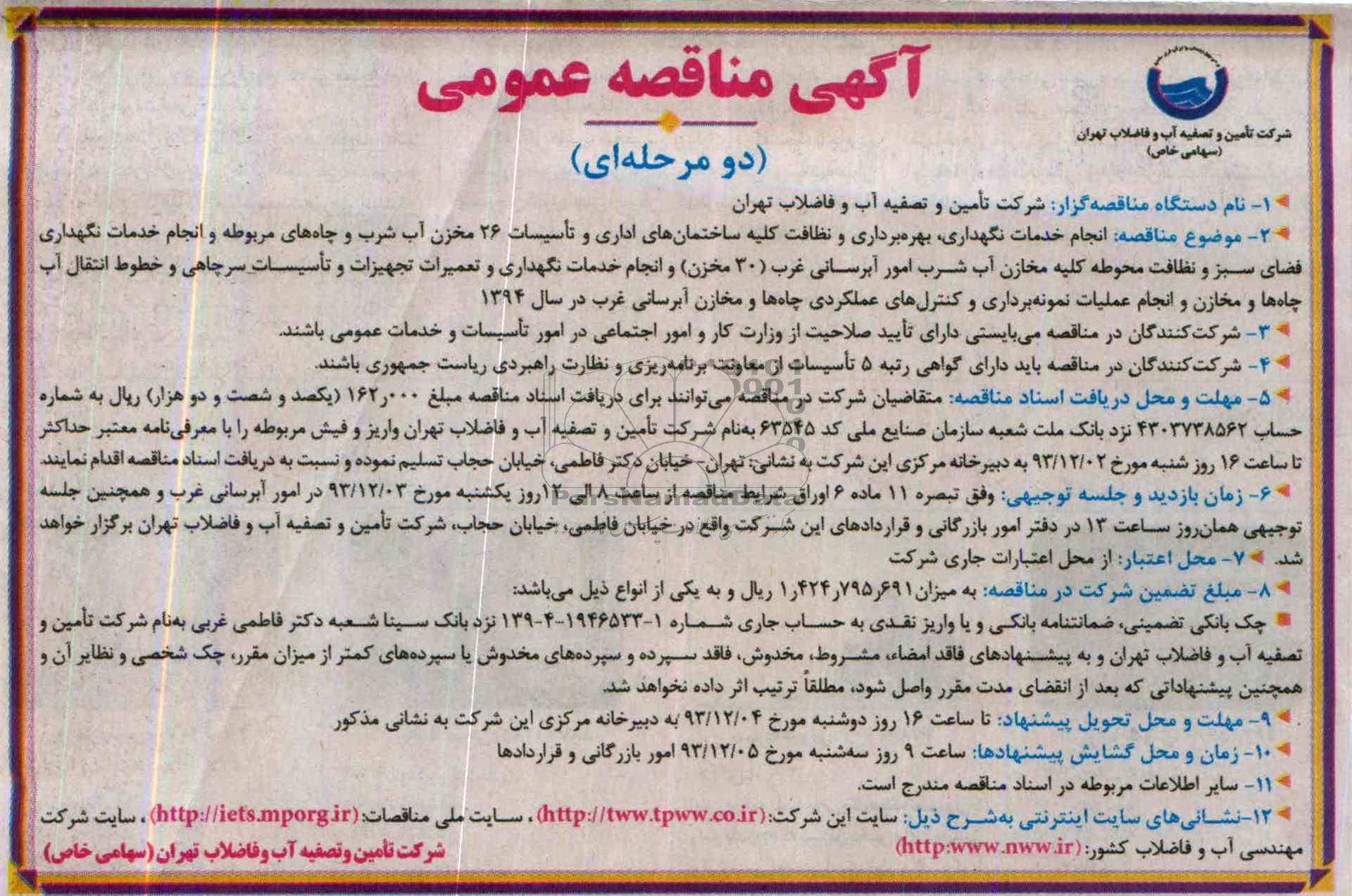 موضوع مناقصه: انجام خدمات نگهداری و بهره برداری و نظافت کلیه شاختمان های اداری و تاسیسات از 26 مخزن آب شرب و چاه های مربوطه و انجام خدمات نگهداری فضای سبز و نظافت محوطه کلیه مخازن آب شرب امور آبرسانی غرب (30 مخزن) و انجام خدمات نگهداری و تعمیرات تجهیزات و تاسیسات سرچاهی و خطوط انتقال آب چاه ها و مخازن و انجام عملیات نمونه برداری و کنترل های عملکردی چاه ها و مخازن آبرسانی غرب در سال 1394