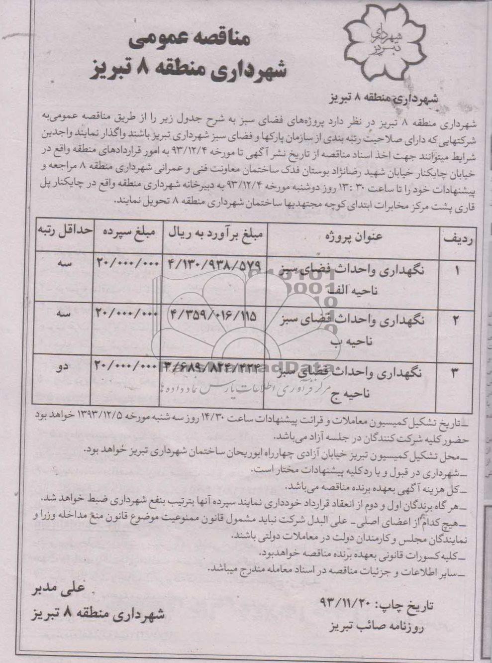 شهرداری منطقه 8 تبریز در نظر دارد پروژه های فضای سبز به شرح جدول زیر را از طریق مناقصه عمومی به شرکت هایی که دارای صلاحیت رتبه بندی از سازمان پارک ها و فضای سبز شهرداری تبریز واگذار نماید. واجدین شرایط می توانند جهت اخذ اسناد مناقصه از تاریخ نشر آگهی تا مورخه 93.12.4 به امور قراردادهای منطقه واقع در خیابان چایکنار خیابان شهید رضا نژاد بوستان فدک ساختمان معاونت فنی و عمرانی شهرداری منطقه 8 مراجعه و پیشنهادات خود را تاساعت 13:30 روز دوشنبه مورخه 93.12.4 به دبیرخانه شهرداری منطقه واقع در چایکنار پل قاری پشت مرکز مخابرات ابتدای کوچه مجتهدیها ساختمان شهرداری منطقه 8 تحویل نمایند.