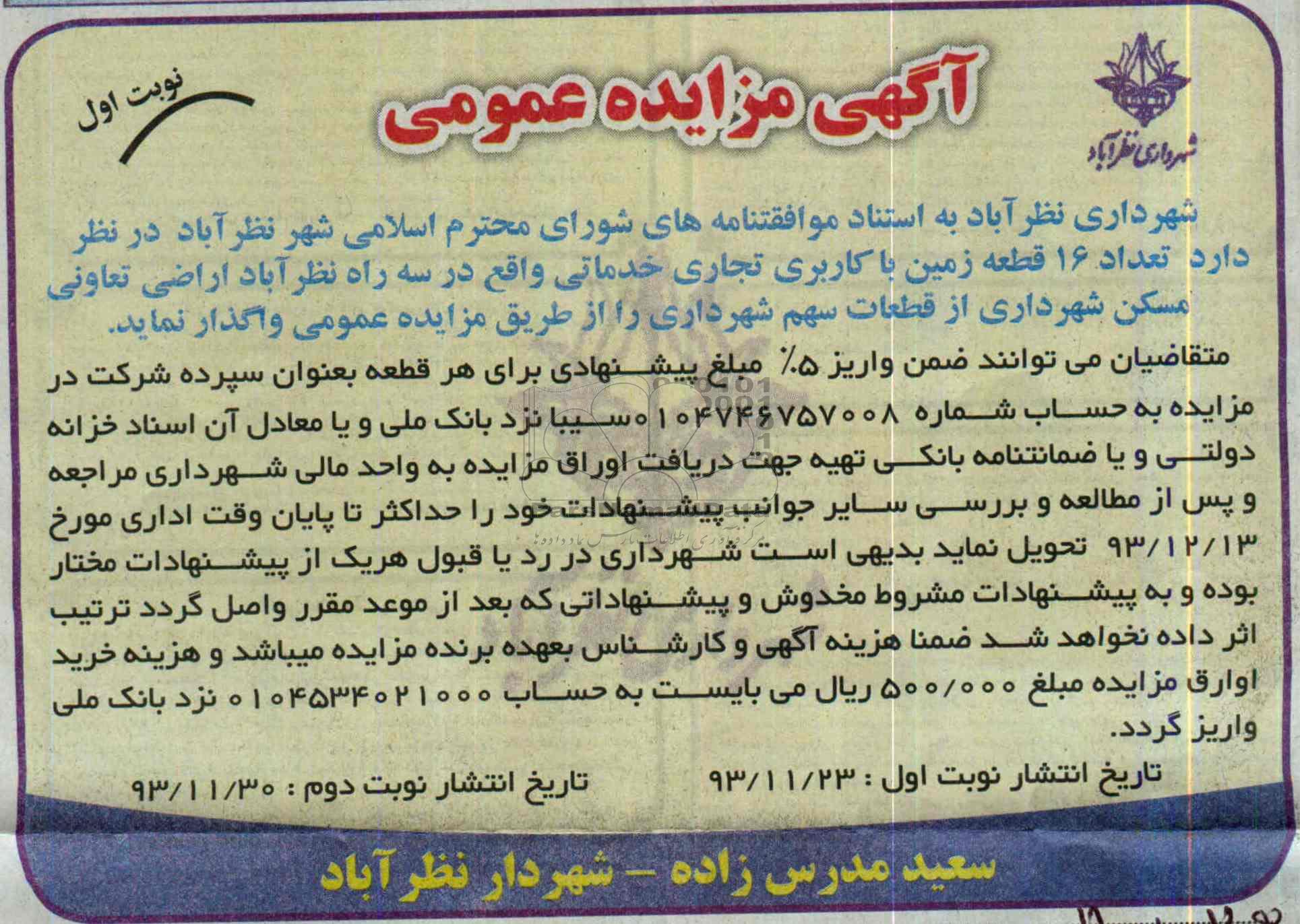 مزایده عمومی مزایده واگذاری 16 قطعه زمین برگزار میگردد. از کلیه افراد متخصص و شرکتهای واجد شرایط دعوت به عمل میآید تا در این مزایده با کد خبرگزاری پارس نماد : 449165 شرکت نمایند تاریخ شروع مزایده : 1393/11/23 مهلت شرکت در مزایده: تا پایان روز 1393/12/13 مکان برگزاری اموال واگذاری استانهای البرز و دستهبندیهای مربوط به این حراجی املاک و زمین میباشد.
