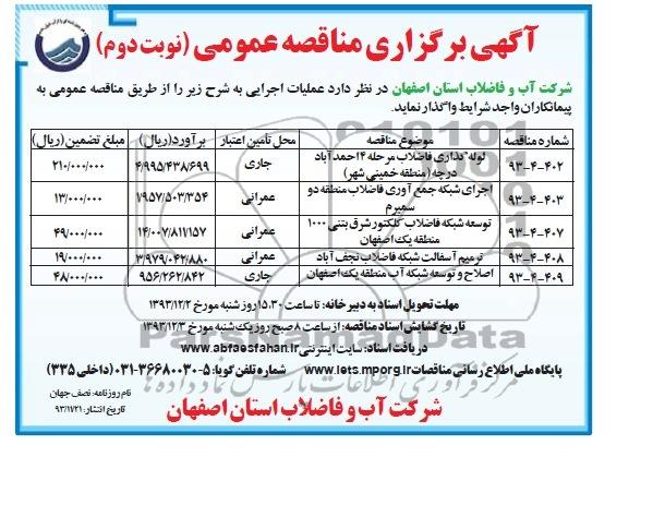شرکت آب و فاضلاب استان اصفهان در نظر دارد عملیات اجرایی به شرح زیر را از طریق مناقصه عمومی به پیمانکاران واجد شرایط واگذار نماید.