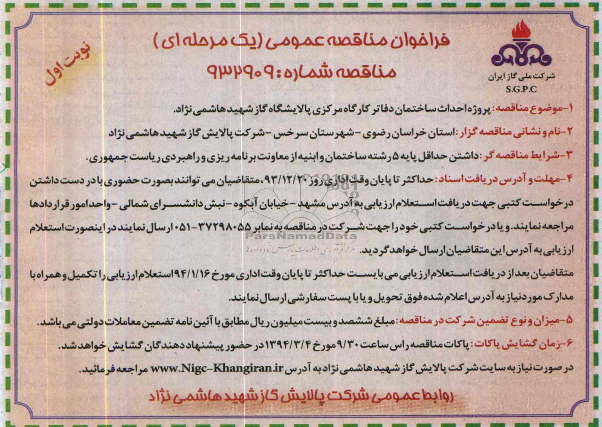 موضوع مناقصه: پروژه احداث ساختمان دفاتر کارگاه مرکزی پالایشگاه گاز شهید هاشمی نژاد