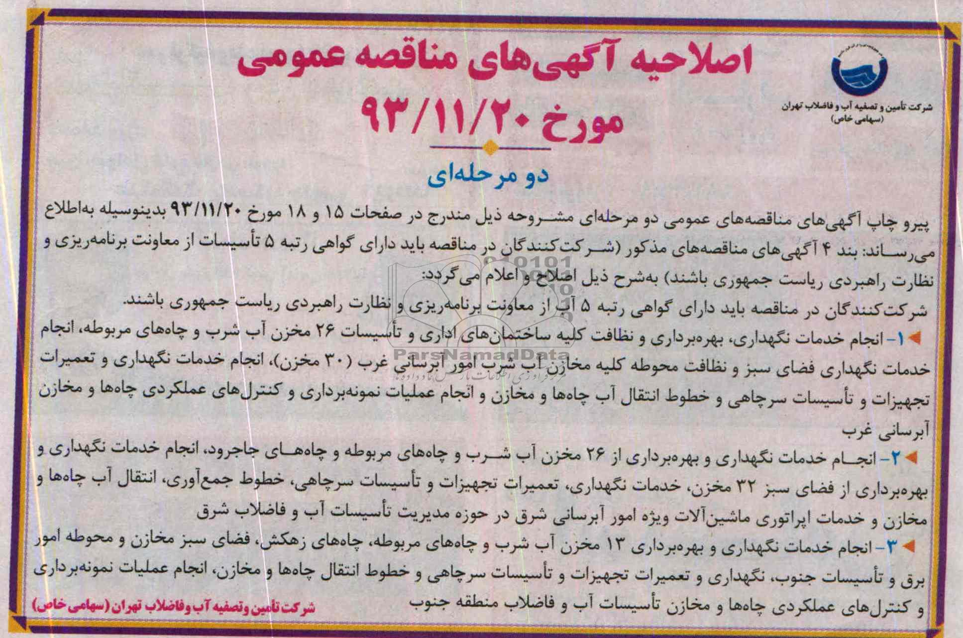 پیرو چاپ آگهی های مناقصه های عمومی دومرحله ای مشروحه ذیل مندرج در صفحهات 15 و 18 مورخه 93.11.20 بدینوسیله به اطلاع می رساند بند 4 آگهی های مناقصه های مذکور شرکت کنندگان در مناقصه باید دارای گواهی رتبه 5 تاسیسات از معاونت برنامه ریزی و نظارت راهبردی ریاست جمهوری باشند به شرح ذیل اصلاح و اعلام میگردد