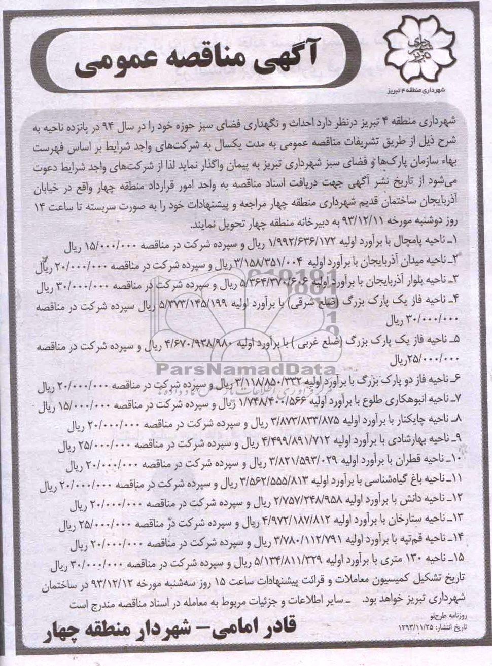 شهرداری منطقه 4 تبریز در نظردارد احداث و نگهداری فضای سبز حوزه خود را در سال 94 در پانزده ناحیه به شرح ذیل از طریق تشریفات مناقصه عمومی به مدت یکسال به شرکت های واجد شرایط بر اساس فهرست بهاء سازمان پارک ها و فضای سبز شهرداری تبریز به پیمان واگذار نماید. لذا از شرکت های واجد شرایط دعوت می شود از تاریخ نشر آگهی جهت دریافت اسناد مناقصه به واحد امور قرارداد منطقه چهار واقع در خیابان آذربایجان ساختمان قدیم شهرداری منطقه چهار مراجعه و پیشنهادات خود را به صورت سربسته تا ساعت 14 روز دوشنبه مورخه 93.12.11 به دبیرخانه منطقه چهار تحویل نمایند.