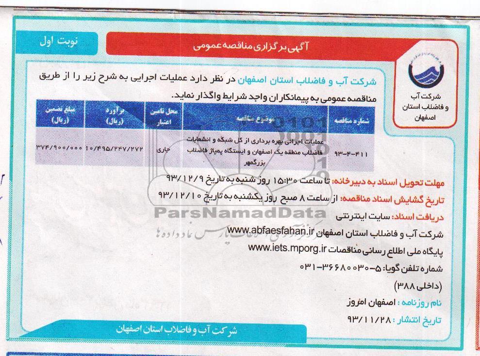 | 411-4-93 | عملیات اجرایی بهره برداری از کل شبکه و انشعابات فاضلاب منطقه یک اصفهان و ایستگاه پمپاژ فاضلاب بزرگمهر | جاری | 10.495.247.272 | 374.900.000 |