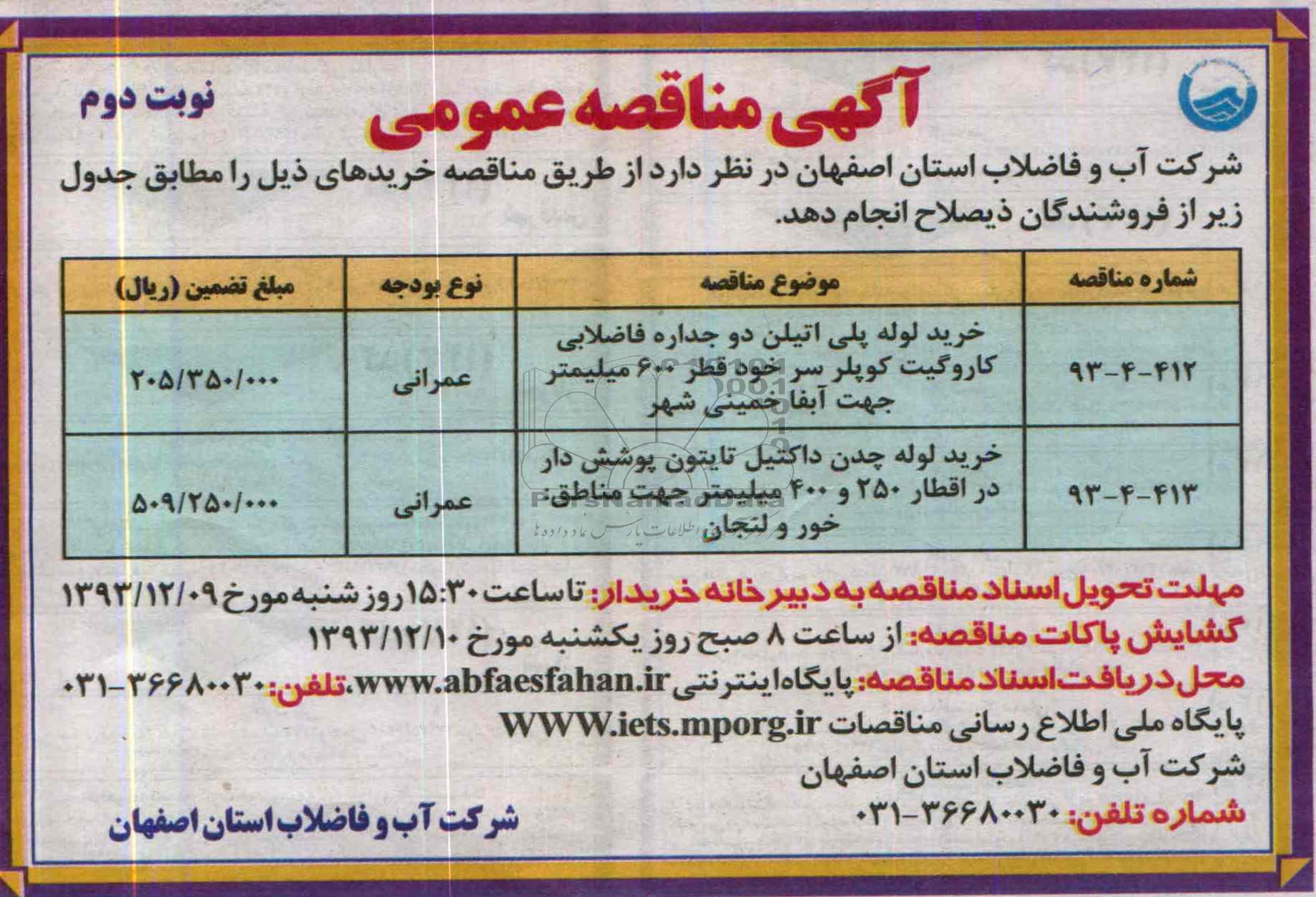 | 413-4-93 | خرید لوله چدن داکتیل تایتون پوشش دار در اقطار 250 و 400 میلیمتر جهت مناطق: خور و لنجان | عمرانی | 509.250.000 |